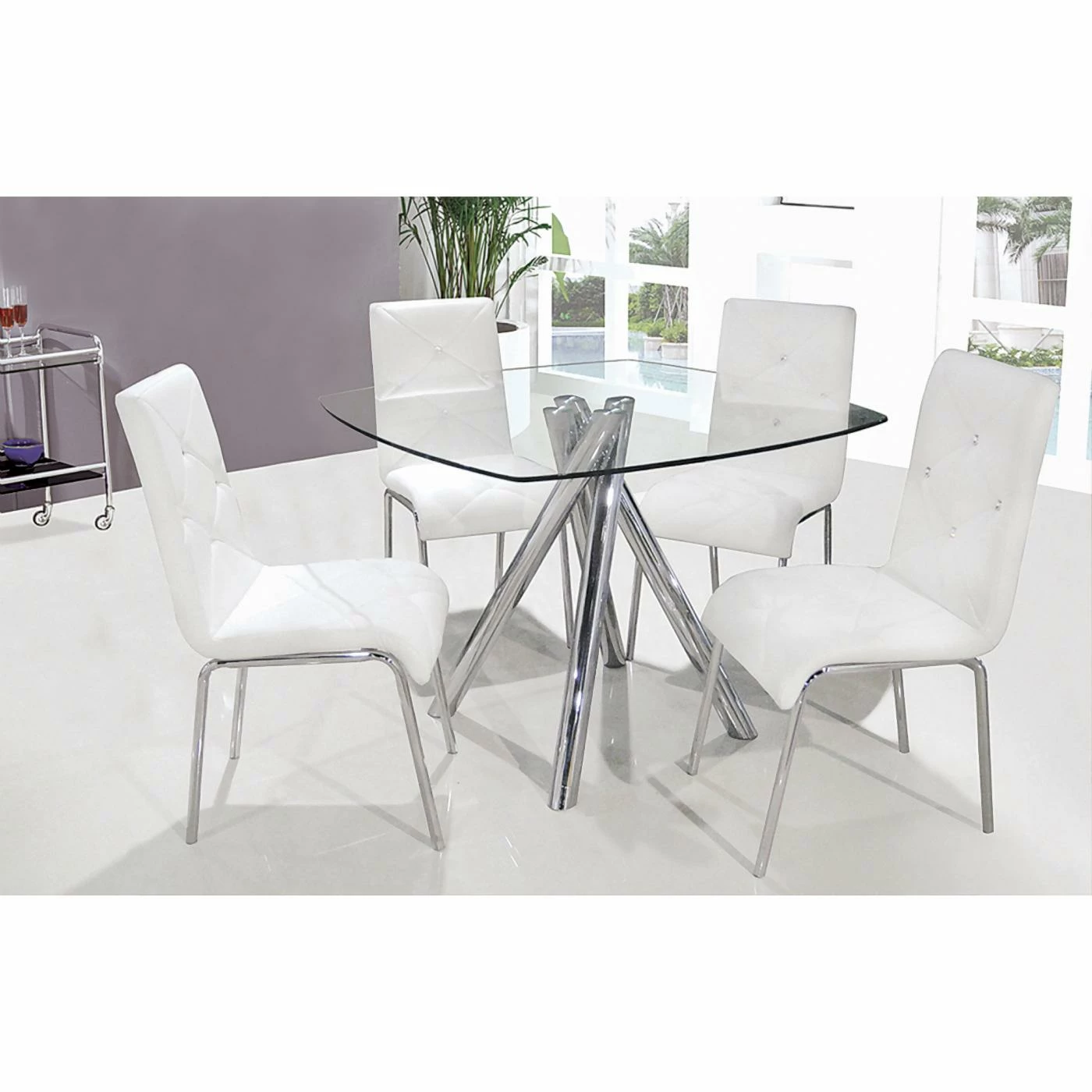 You wouldn’t think of most dining table sets as having a sculptural quality, but the Best Master Furniture Square 5 Piece Dining Table Set isn’t like most sets. This design includes a table surrounded by four matching chairs. At the center is a glass-topped table with a base crafted from four rods of chromed metal. Each chair echoes the same design with a chromed metal frame. A curved, single-piece seat is covered with dense foam that’s wrapped in soft faux-leather. Tufted crystals add a glamorous touch to the already glamorous design. Choose from the available color options.