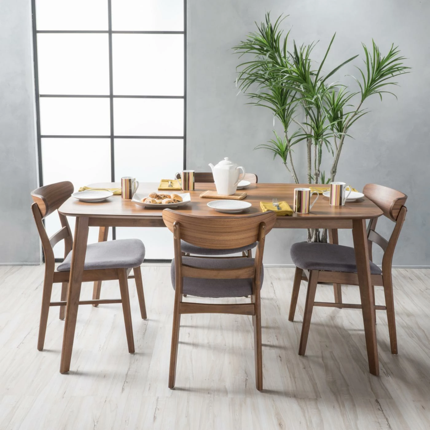 Decorating your dining room, kitchen, or breakfast nook in mid-century modern style is simple with the Idalia Rectangular 5 Piece Dining Table Set. In the set, you’ll find a rectangular dining table and four chairs positioned on sleek, solid rubberwood legs. The veneered, engineered wood tabletop provides plenty of space for up to four people to dine comfortably. Choose from the available finishes to best coordinate with your existing dining room decor.
