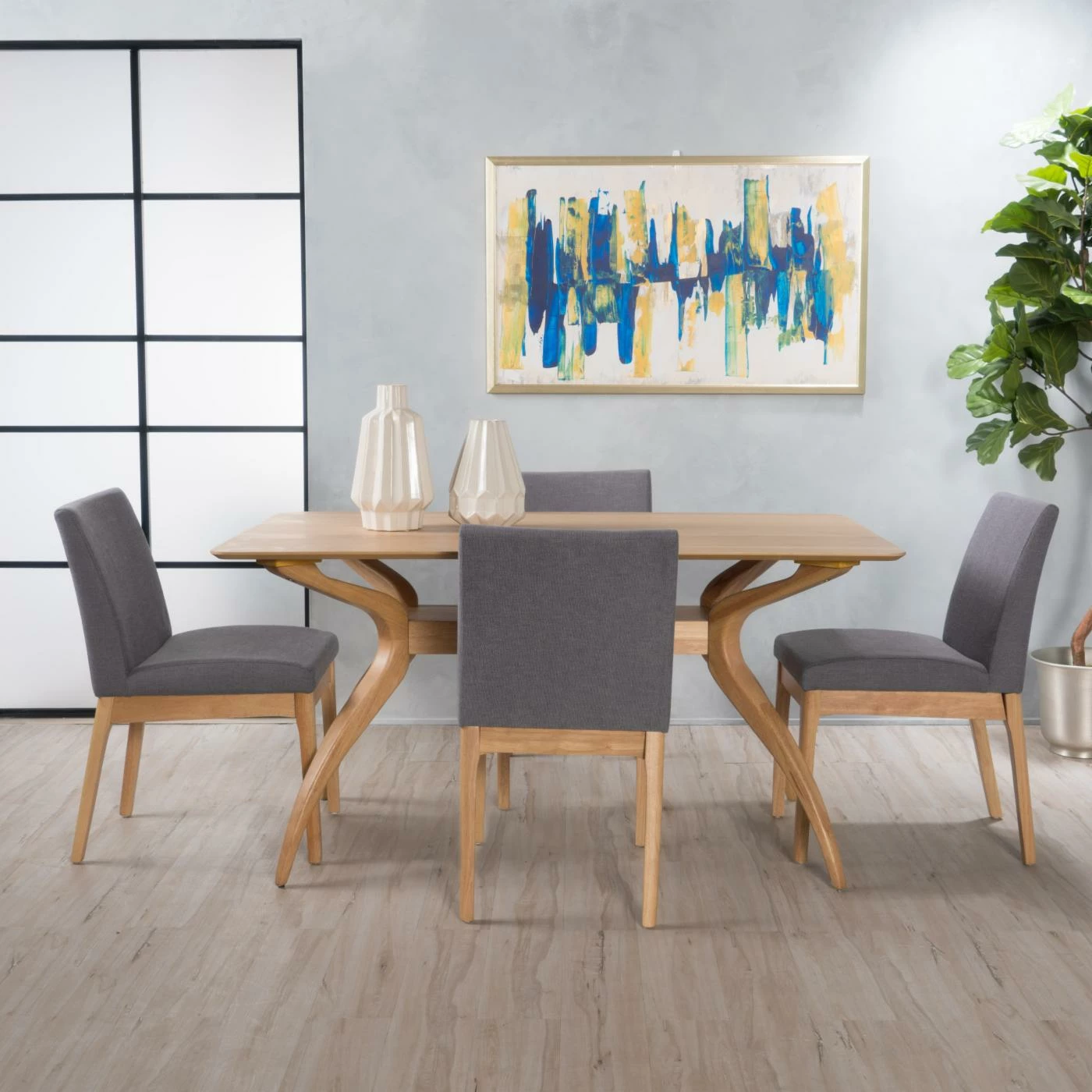 Establishing a mid-century modern dΓ©cor theme in your dining area is an effortless affair when you have the Kwame Rectangular 5 Piece Dining Table Set. Dramatic concave rubberwood table legs and splayed rubberwood chair legs give the dining set a retro aesthetic. The natural oak finish on the tables and four chairs adds another vintage-inspired element to the design. Each chair is padded and clad in light gray fabric for comfort, and the sizable engineered and veneered wood top offers plenty of elbow room for four people.