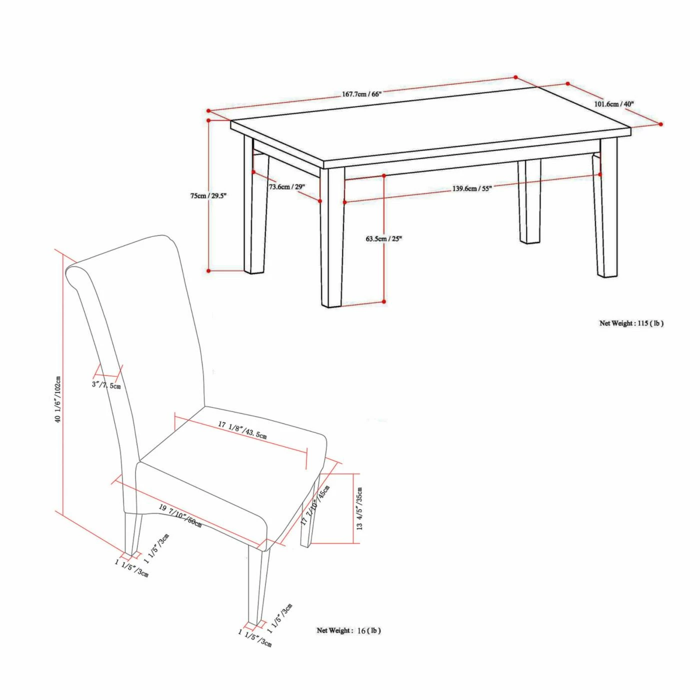 - Each Chair: 17.8W x 19.7D x 40.2H in.