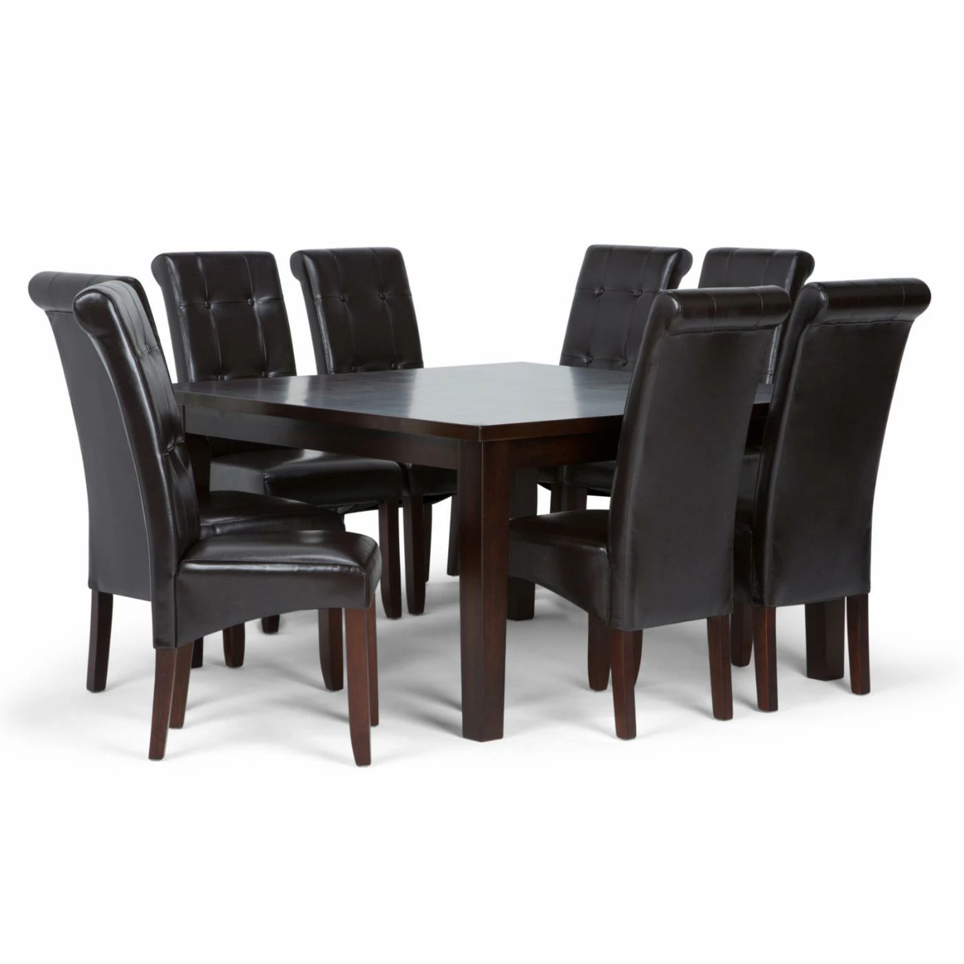 The Brooklyn + Max City 9 Piece Dining Table Set‘s eight chairs are perfectly suited to match the dining table. From behind, fully upholstered backrests appear elegantly long, with rolled top rails. Subtle button tufting completes the look. Dense, durable rubberwood is used in the frames for maximum durability. Hand-applied wood stain is topped with a protective lacquer. Webbing under the seats provides advanced support.