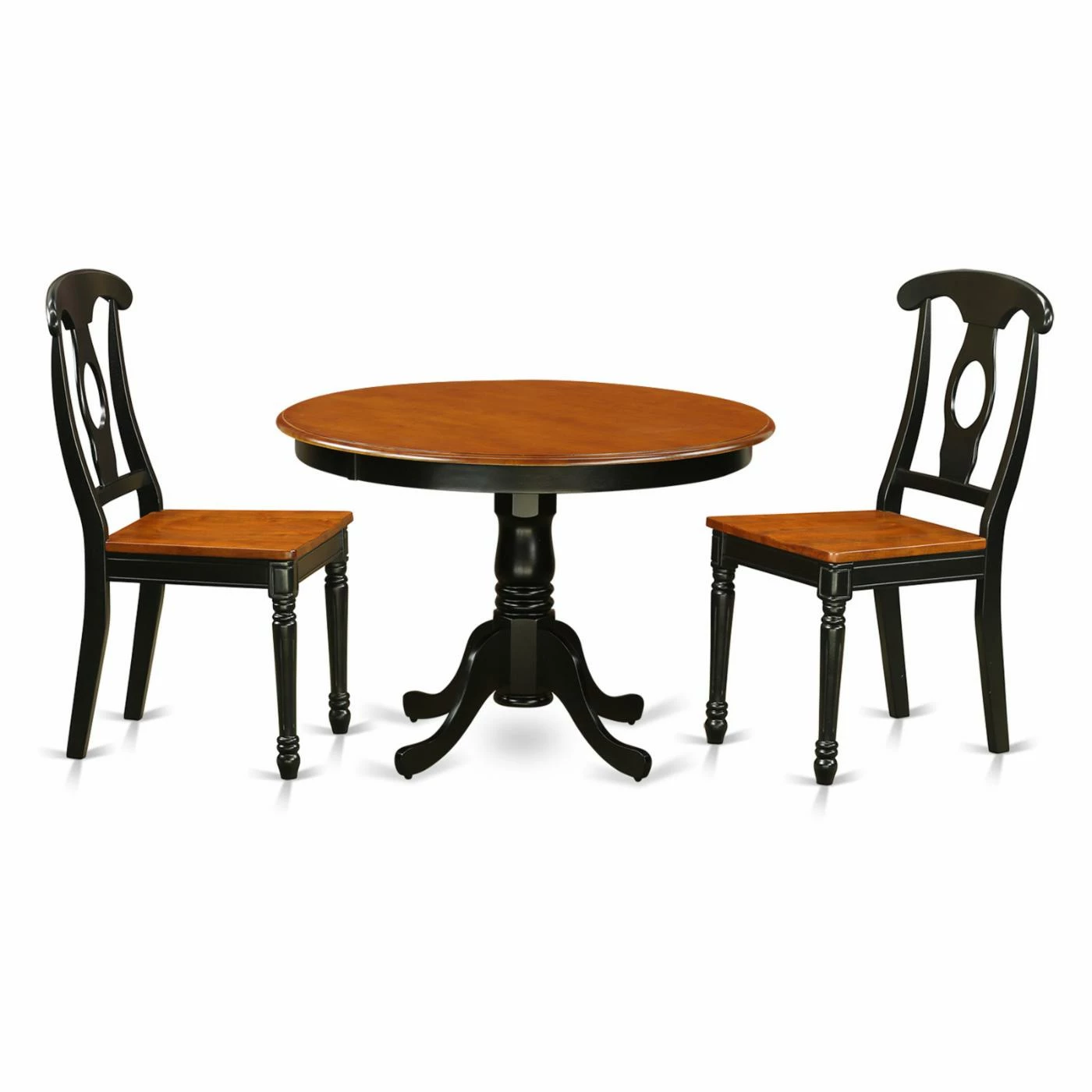 Give your eating area a modest, craftsman-style touch with the East West Furniture Hartland 3 Piece Keyhole Dining Table Set. This gorgeous set offers you two armless chairs and a round table. The chairs boast a shapely backrest crown and a splat-back rest with a round keyhole cutout. Fine turned accents define the table, resting on curved feet. Thick hardwood constructs the frame, finished in your choice of available color. Select seat option from the available.
