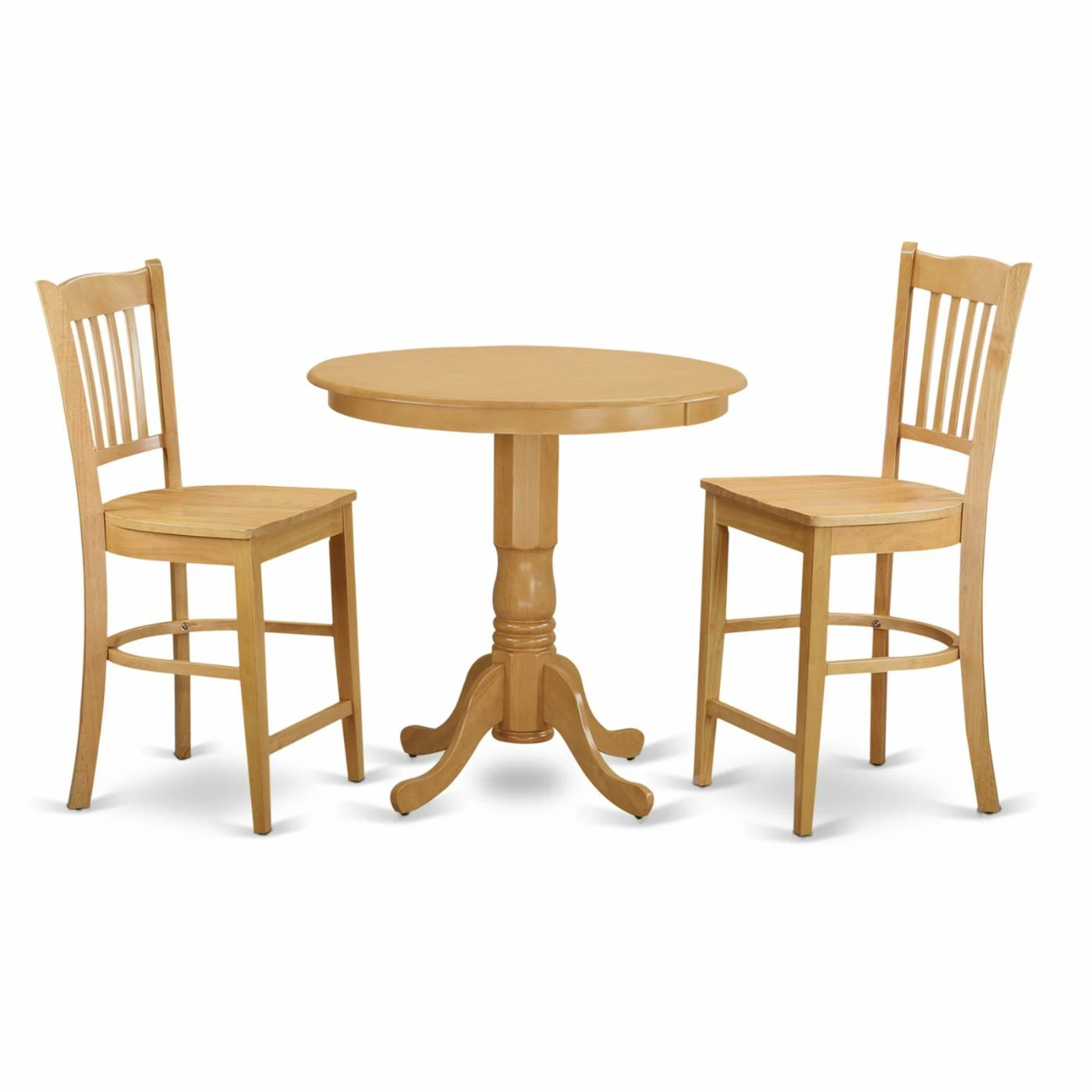 The East West Furniture Jackson 3 Piece Comb Back Dining Table Set brings traditional design and comfy dining to your home. The table and chairs are crafted of Asian hardwood for lasting use and rustic charm. The comb-style backs offer comfort while you sit while the pedestal table base ensures support. This dining set is offered in your choice of available finish and seats two to four people.
