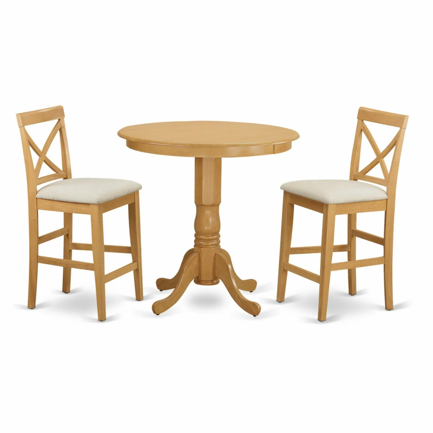 Sleek and simple traditional styling makes the East West Furniture Jackson 3 Piece High Cross Dining Table Set perfect for any small kitchen or dining room. The chairs and table showcase solid Asian hardwood craftsmanship for lasting use. Cross backs ensure supportive comfort. Choose from available seat types to customize the chairs. This dining table, which seats two, rests on a pedestal base with striking spindle detailing.
