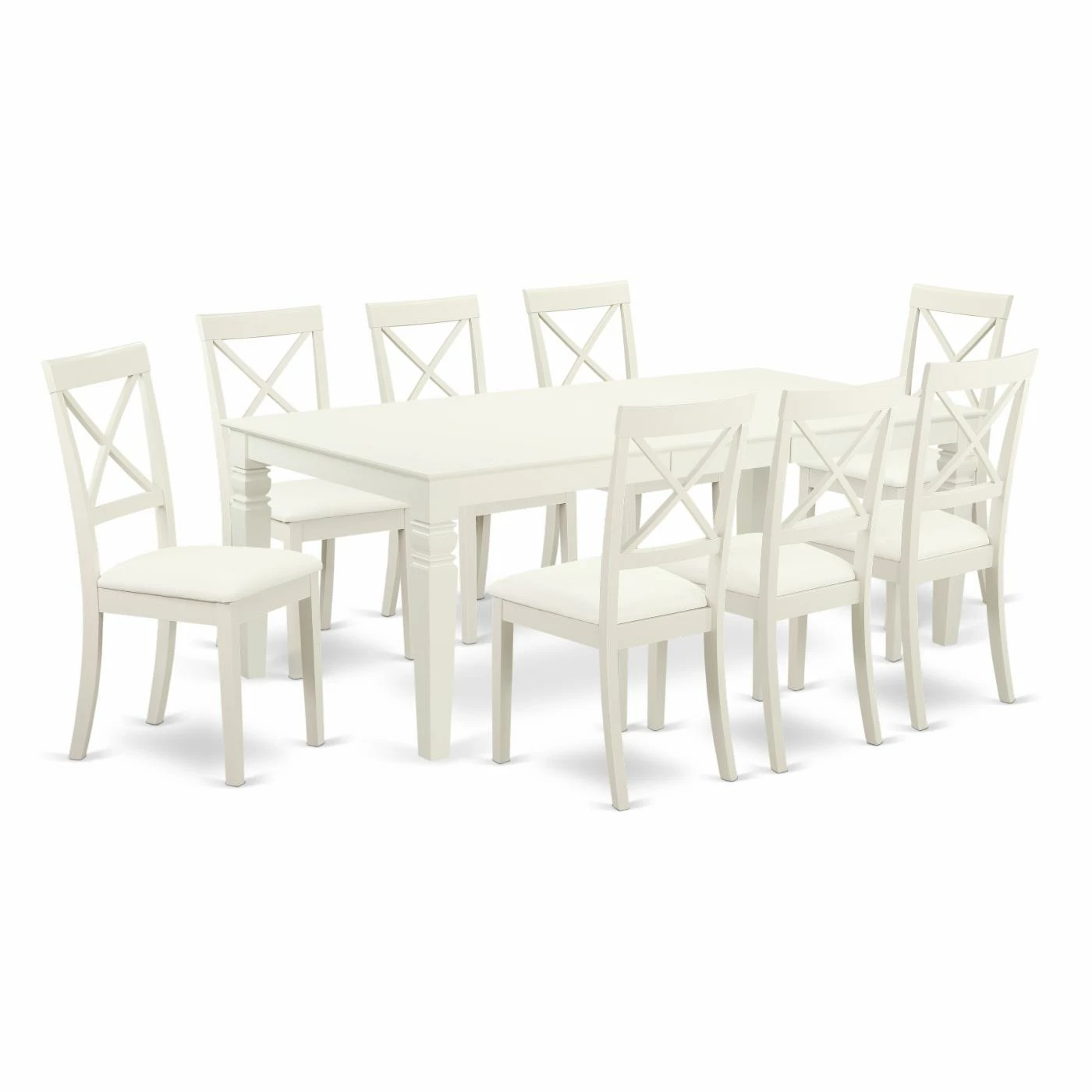 Accent your new dining room with the East West Furniture Logan 9 Piece Rectangular Dining Set with Faux Leather Chairs for a brilliant, clean modern centerpiece. This dining set provides eight matching chairs and a rectangular table. Solid rubberwood constructs the frame, finished in a refreshing linen white. The table is perched on block legs with carved notched and comes with an extension leaf. Open cross-backs accent the chairs. The seats are padded with foam and upholstered in white faux leather.
