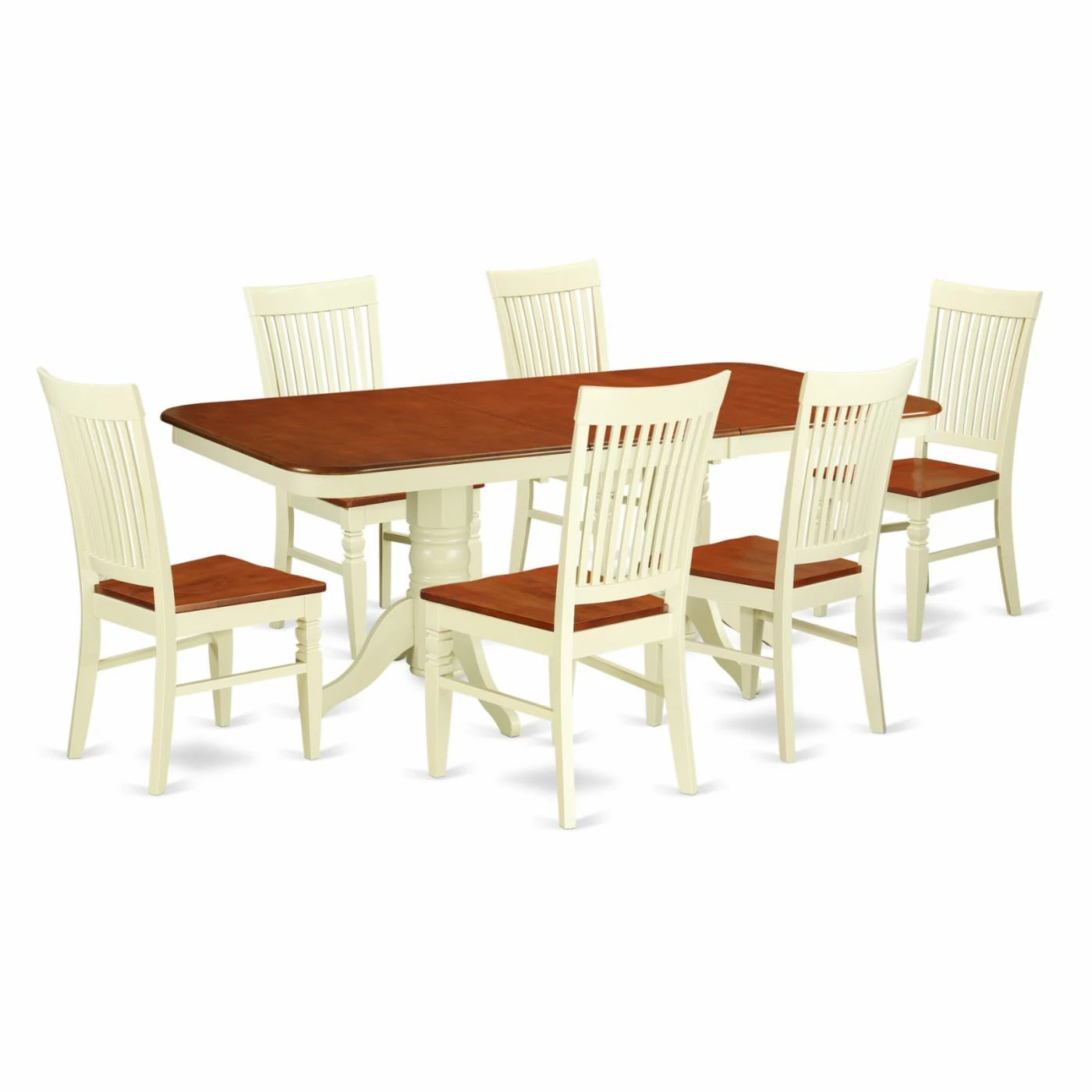 Make your dining room suitable for casual daily meals to formal gatherings with the East West Furniture Napoleon 7 Piece Oval Dinette Set with Wood Chairs. With a two-tone finish and solid rubberwood construction, the set casually complements nearly any style. A rectangular table with rounded corners and six matching chairs are included, all crafted from solid rubberwood. A double-pedestal base supports the table, accented with curved feet and turned lines and the chairs each feature contoured seats and slatted backrests. An extension leaf is provided. Two-tone bright white and cherry finish the set.