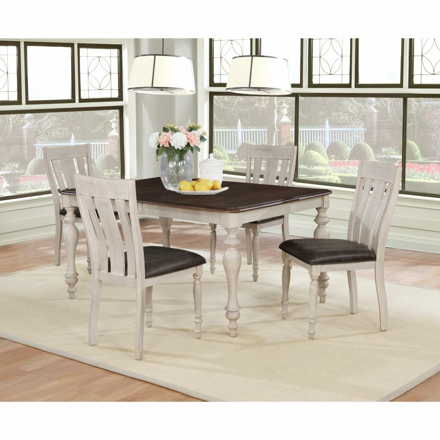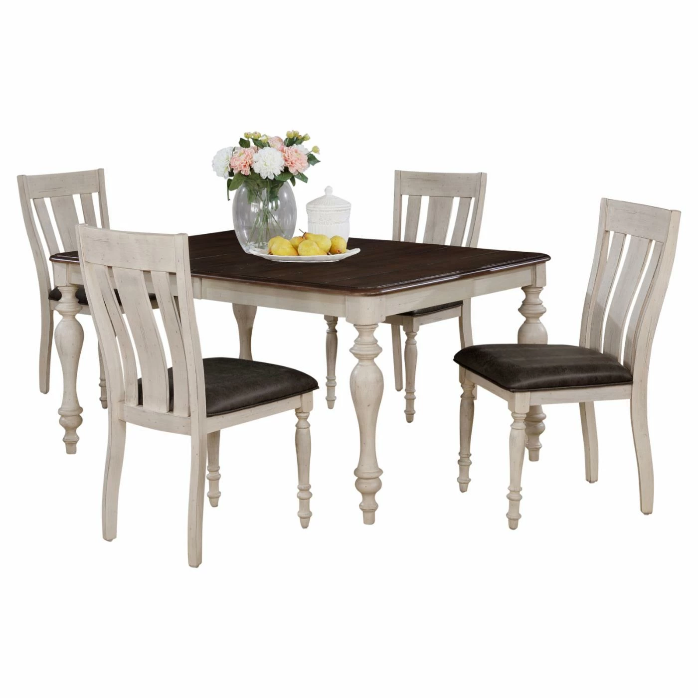 Gather around the Roundhill Furniture Arch Rectangular 5 Piece Dining Set for a night of good food and even better company. Your guests will love sitting on these wooden chairs, finished in an elegant and neutral white wash. The slat backs of the four included chairs are curved for your comfort and nicely complement the turned legs of the table. The rich espresso finish on the tabletop is easy to match with your chic farmhouse style, and the plush faux leather seats will keep you comfy while you’re entertaining. Some assembly required.