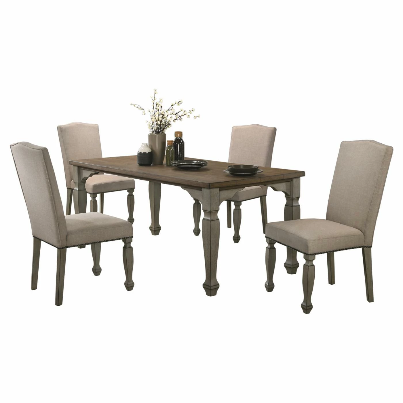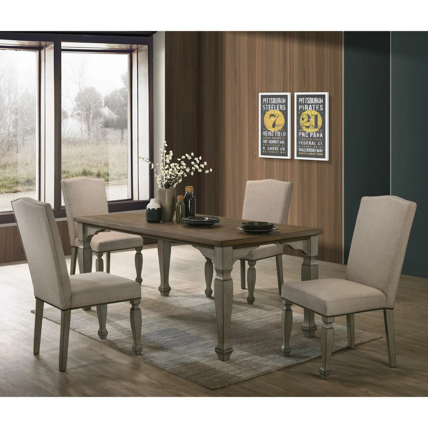 Elegant details and handsome finishes allow the Roundhill Furniture Breda 5 Piece Dining Set to be a stunner in your dining room. The table boasts a solid wood and veneer construction with a plank top. Its blend of antique gray and dark oak finishes is striking while its carved legs and base are classic in the best way. The chairs feature crisp fabric upholstery that’s becomingly accented by nailhead trim.