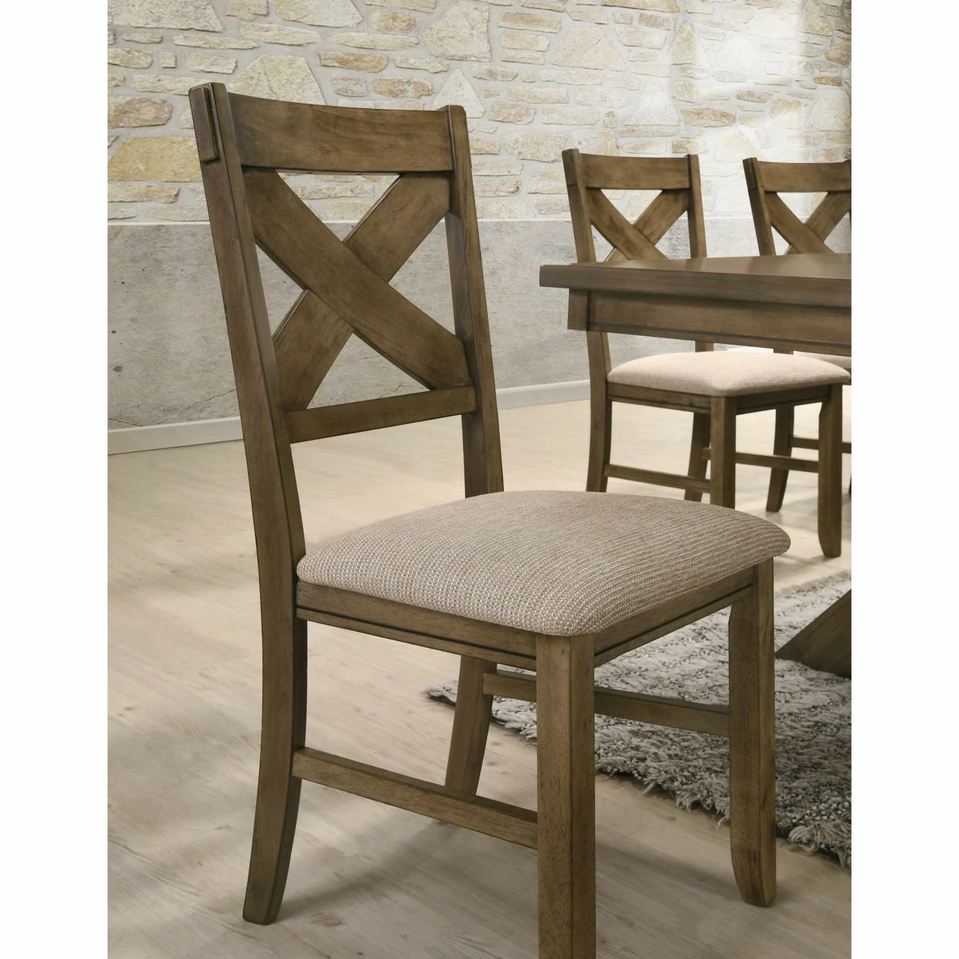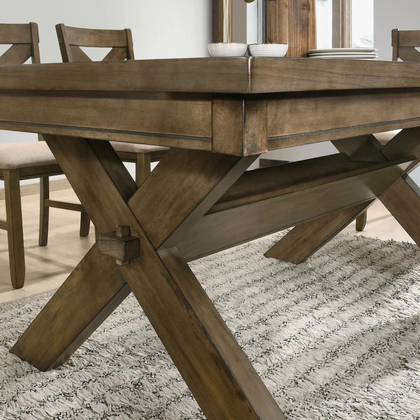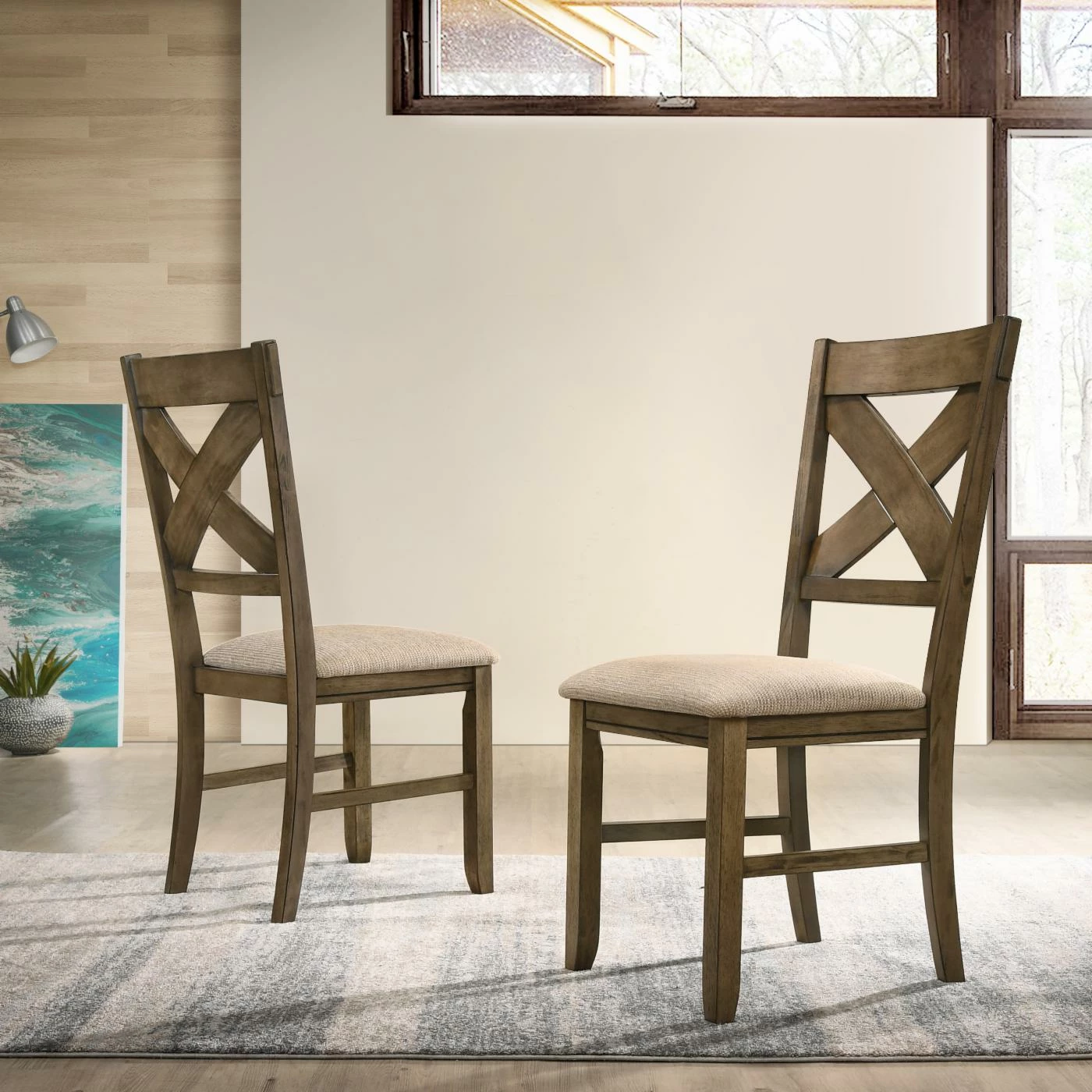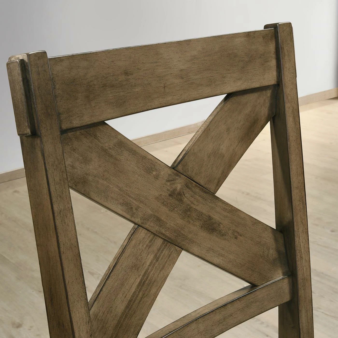 A distressed maple finish on the pieces in the Roundhill Furniture Raven 7 Piece Dining Set provides your space with farmhouse-chic detail. This dining set includes a dining table and six coordinating chairs, all constructed from solid rubberwood and engineered wood. The table features an X-shaped trestle base and butterfly leaf design. The armless dining chairs have a thick X-back, beige fabric upholstered seats, and tapered legs. Pair this set with other items from the Raven Collection for a complete look in your dining room.