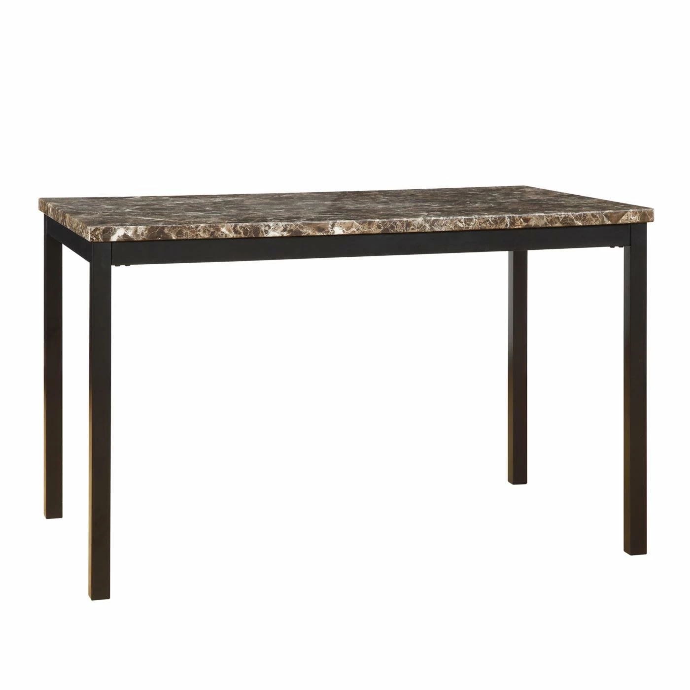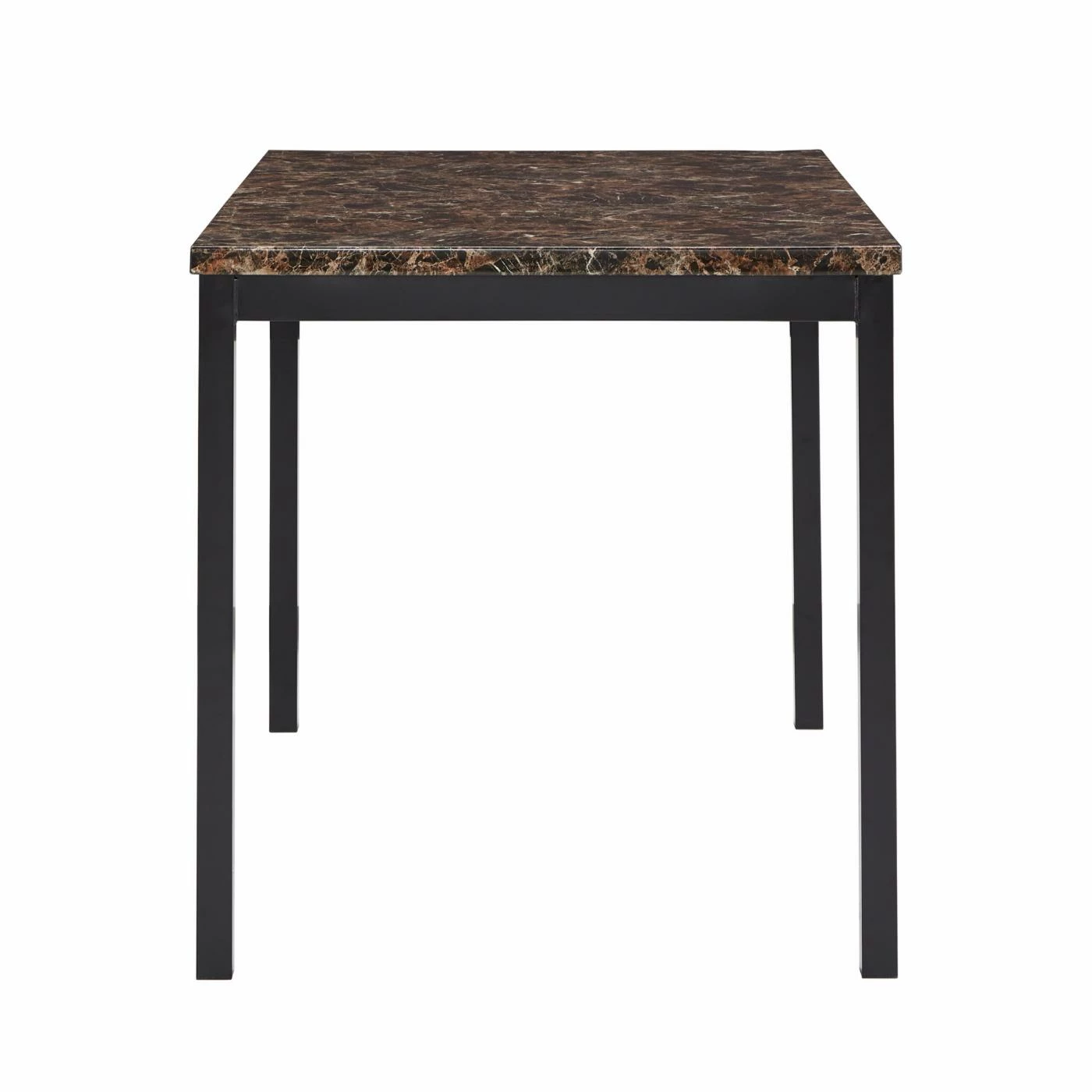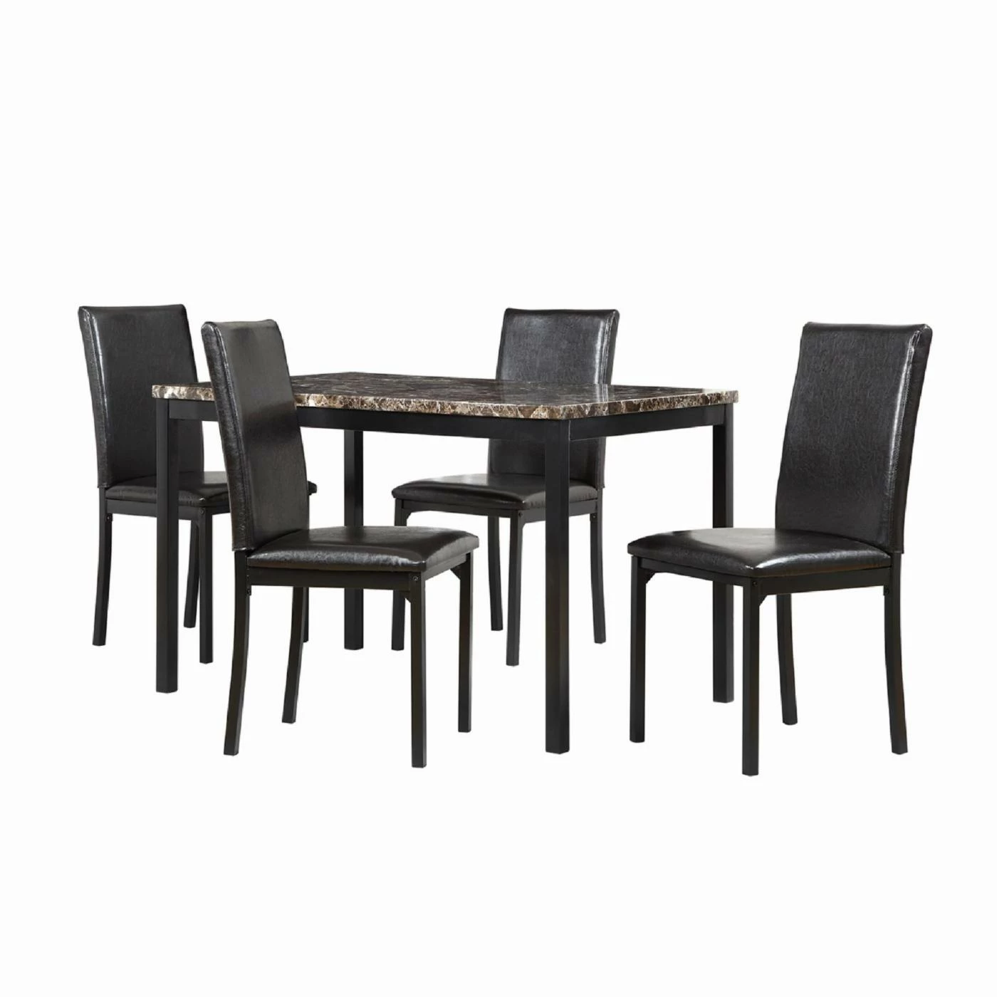 The luxurious faux marble table top is the highlight of the sleek and contemporaryΒ Weston HomeΒ Tempe 5-Piece Metal Table with Faux Marble Top Dining Set – Dark Brown. It includes four slim metal parson’s style chairs with dark brown finish and matching vinyl upholstered seats and backs. Perfect for your modern dining decor!