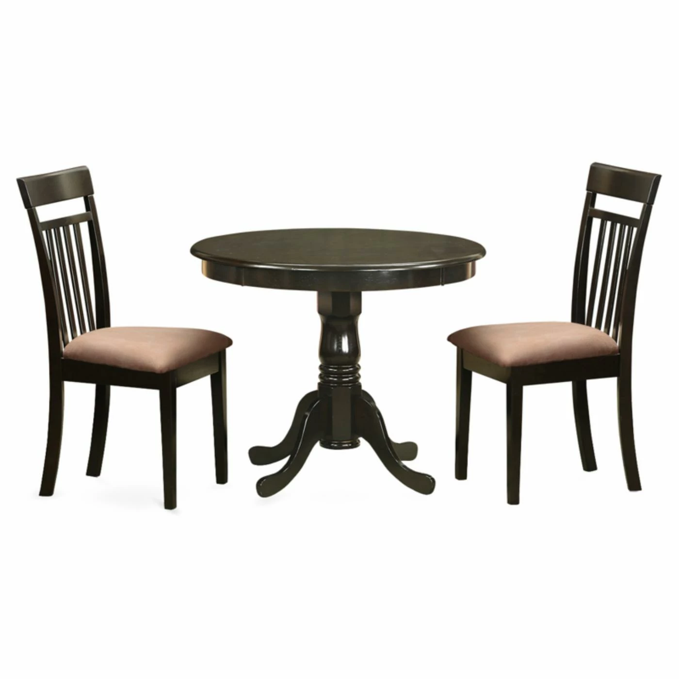 Ornate wooden craftsmanship gives traditional richness to this East West Furniture Antique 3 Piece Pedestal Round Dining Table Set with Capri Microfiber Seat Chairs. The tabletop boasts a supportive and ornately crafted pedestal base. The chairs are equipped with slat backs as well as soft microfiber upholstery for cozy seating. This set is also offered in your choice of available finish.