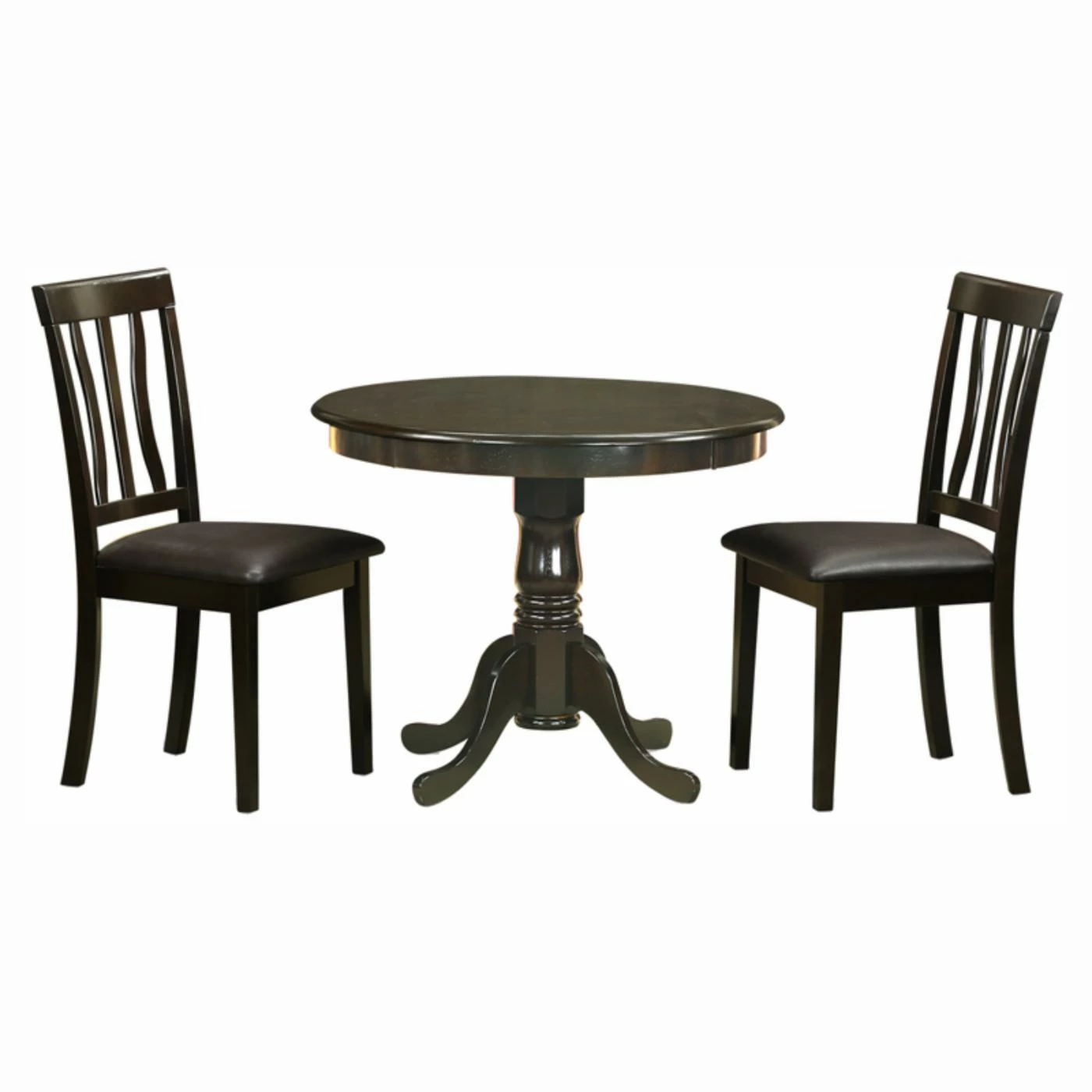 With this East West Furniture Antique 3 Piece Pedestal Round Dining Table Set with Faux Leather Seat, you have a practical and functional furniture set that also makes a style statement in your home. Featuring solid wood construction, this set is offered in your choice of available color to coordinate with multiple dΓ©cor types. The roomy surface of the table feature beveled edges and an elegantly carved pedestal base for stability. The slatted back give the chairs additional back support and they are also covered in rich faux leather upholstery for comfort.