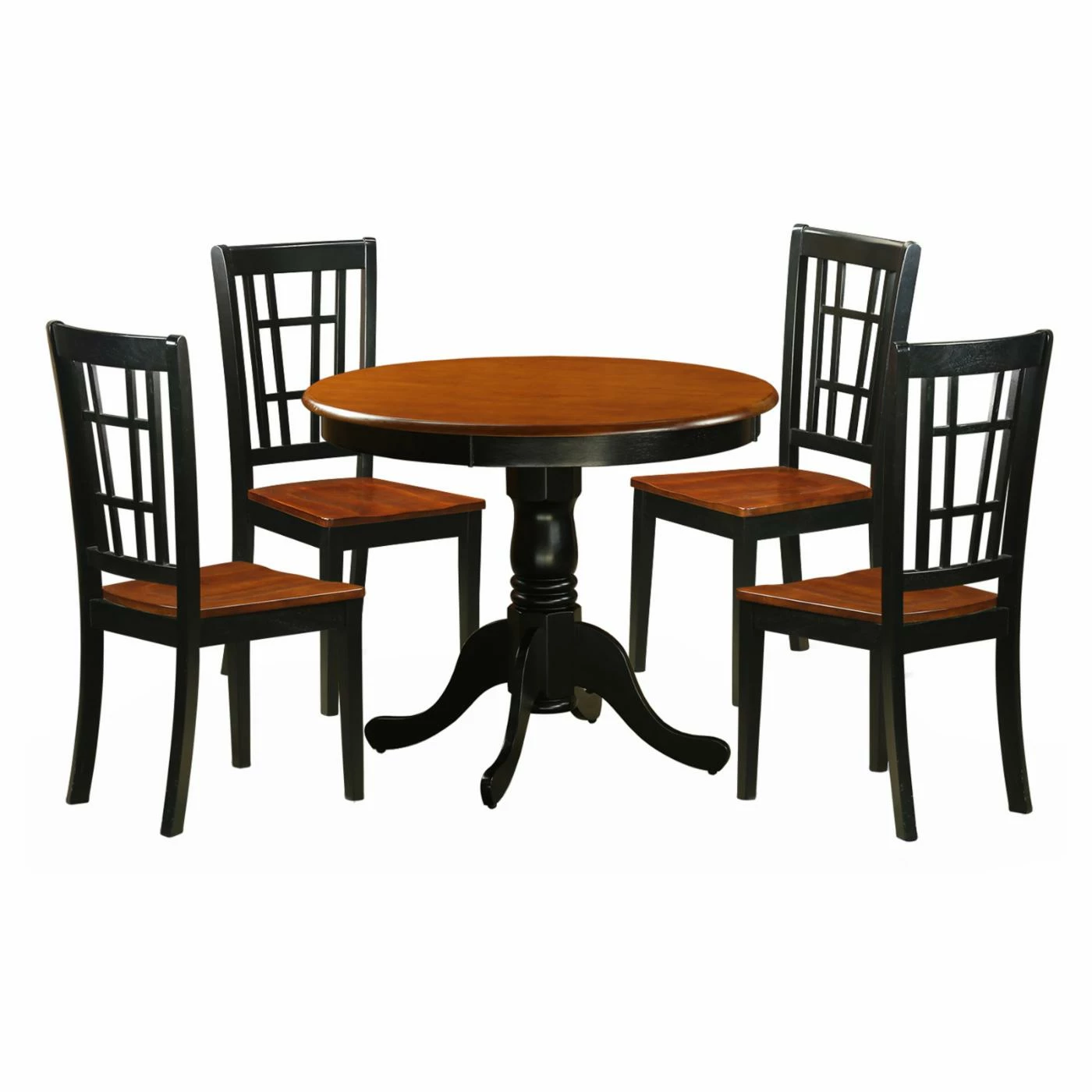 Traditional simplicity is what you’ll get with this East West Furniture Antique 5 Piece Pedestal Round Dining Table Set with Nicoli Wooden Seat Chairs. Finished in black and cherry hues, this set boasts solid wood construction. The pedestal base gives the table support and stability, while the chairs boast curved back for comfortable sitting. This set looks lovely placed in a dining room or large kitchen.