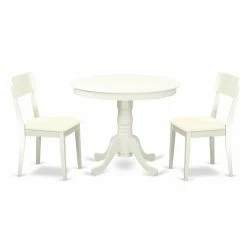 Create an elegant dining area in your compact living space with the East West Furniture Antique ANAD3 Three Piece Round Pedestal Dining Set. The set includes a round pedestal table and two matching chairs fabricated out of durable solid wood in a go-with-everything linen white finish. Padded, faux leather-upholstered seats ensure your comfort during meals.