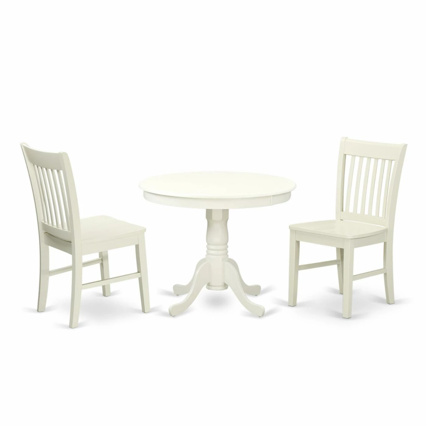 Simple, yet sophisticated, the East West Furniture Antique ANNO3 Three Piece Round Pedestal Dining Set is perfect for a small transitional or casual traditional dining area. Two slat-back chairs with straight legs coordinate perfectly with the included pedestal table. Built out of solid wood, the set is ready to withstand the wear and tear of daily use.