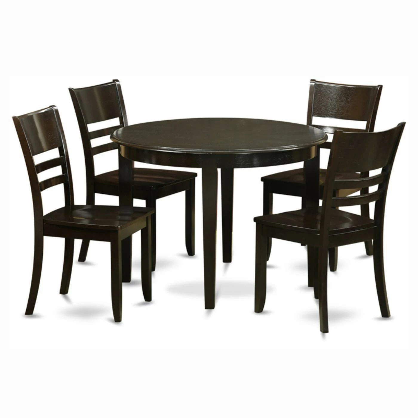A deep cappuccino, the East West Furniture Boston 5 Piece Round Dining Table Set with Fields Wooden Seat Chairs coordinates with any style. A glossy finish over solid wood makes a true statement, allowing up to four people to sit comfortably. Customize chairs to suit your needs in either solid wood, upholstered, or padded seats.
