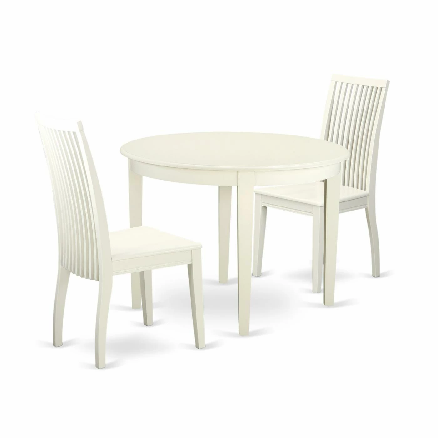 Give your dining room or kitchen a modern update with the East West Furniture Boston BOIP3 Three Piece Round Dining Table Set. The set includes a minimalist round table and two ergonomic slatted chairs. A clean linen white finish and tapered, square legs tie the durable solid hardwood set together.