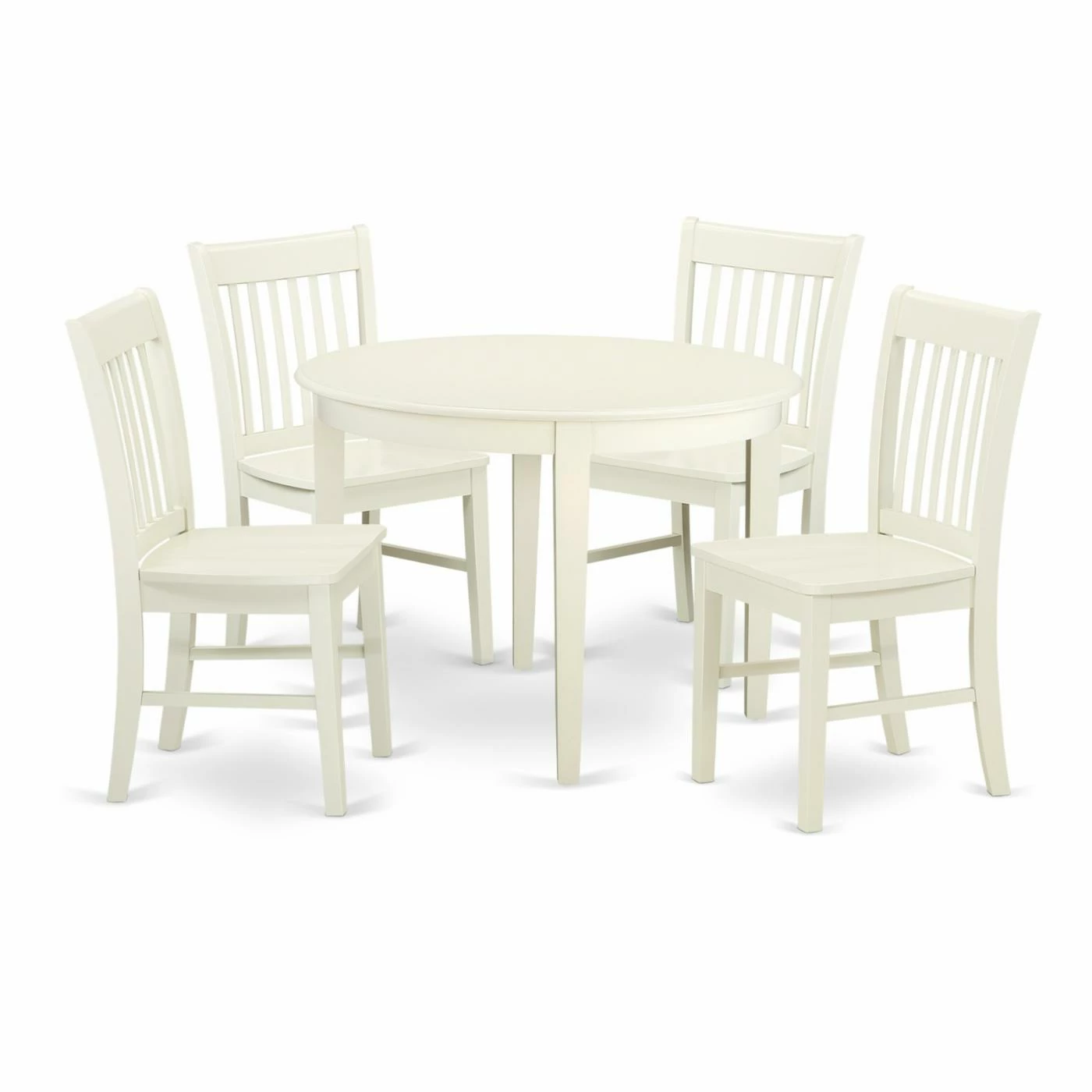 Simple lines and a sleek linen white finish give the East West Furniture Boston BONO5 Five Piece Round Dining Table Set tons of modern appeal. The dining set is built to stand the test of time out of solid Asian hardwood and includes four slatted dining chairs and a round table. Each piece stands on tapered legs, tying the set together.