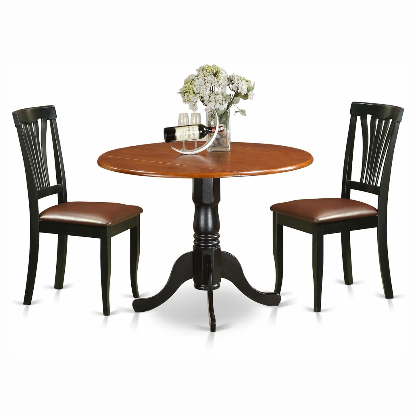Just the right size and just the right style, the East West Furniture Dublin 3 Piece Round Dining Table Set with Faux Leather Avon Chairs is the perfect way to finish your dining space. This set includes a round drop-leaf table with classic turned pedestal base, and two fanned-back chairs. Supple faux-leather upholstery provides a luxurious touch. Choose from available finishes. Assembly required.