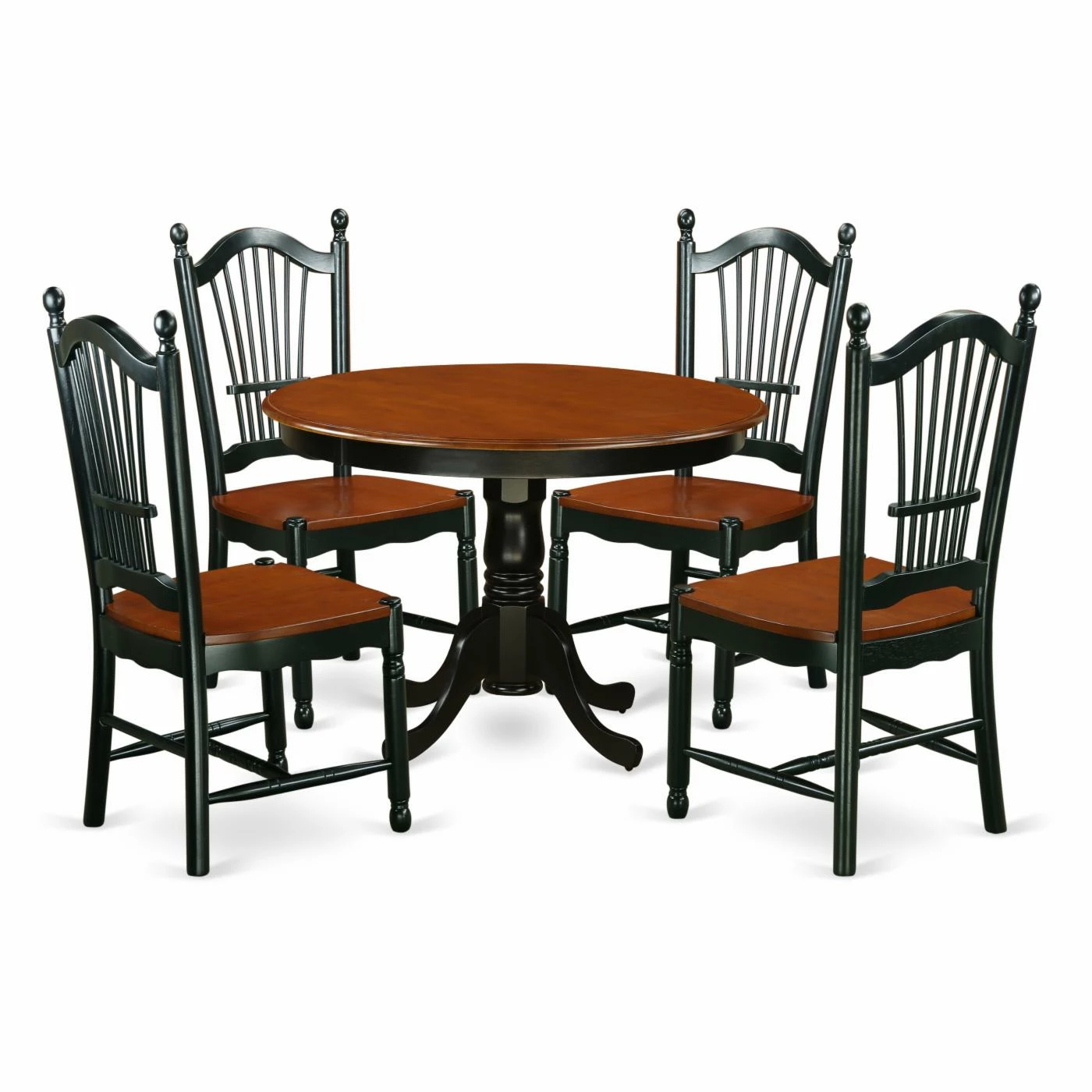 Provide an elegant spot for dining in your eat-in kitchen, breakfast nook, or dining room with the East West Furniture Hartland HLDO5 Five Piece Round Pedestal Dining Table Set. Although the solid hardwood dining set has a compact footprint. The cherry and black two-tone finish makes a big, bold statement. The set contains a stately pedestal table and four chairs with harp backs and scalloped aprons.