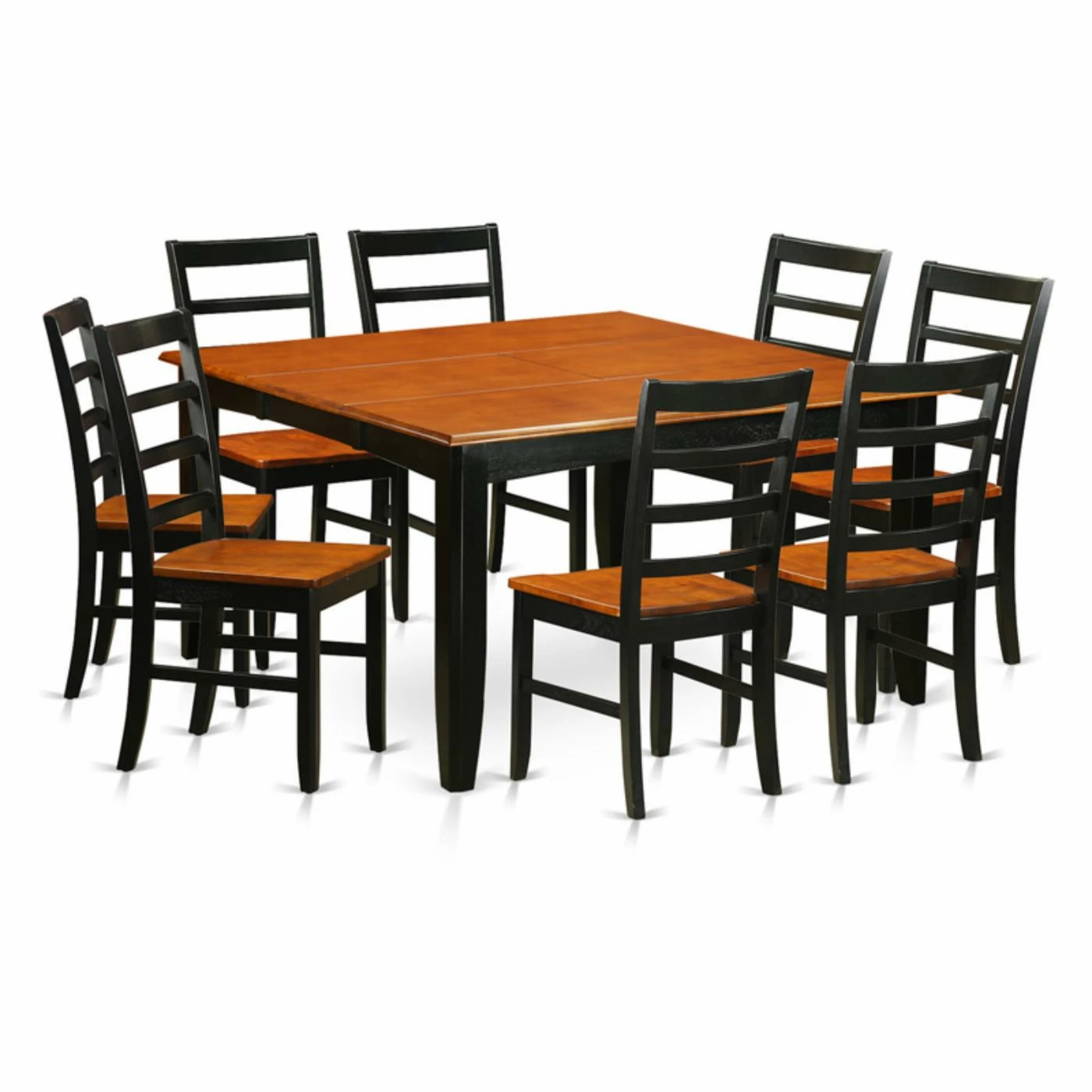 Ready to change up your dedicated dining area? The East West Furniture Parfait 9 Piece Square Dining Set with Wood Chairs is here to fulfill all your needs. The casual-modern set includes a rectangular table and eight chairs. Each piece is made from durable rubberwood solids with block legs. The table features an extension leaf that greatly expands its surface. A classic ladder-back and contoured seats make the chairs endlessly comfortable and supportive. The set is finished in a two-tone black and cherry brown color scheme.