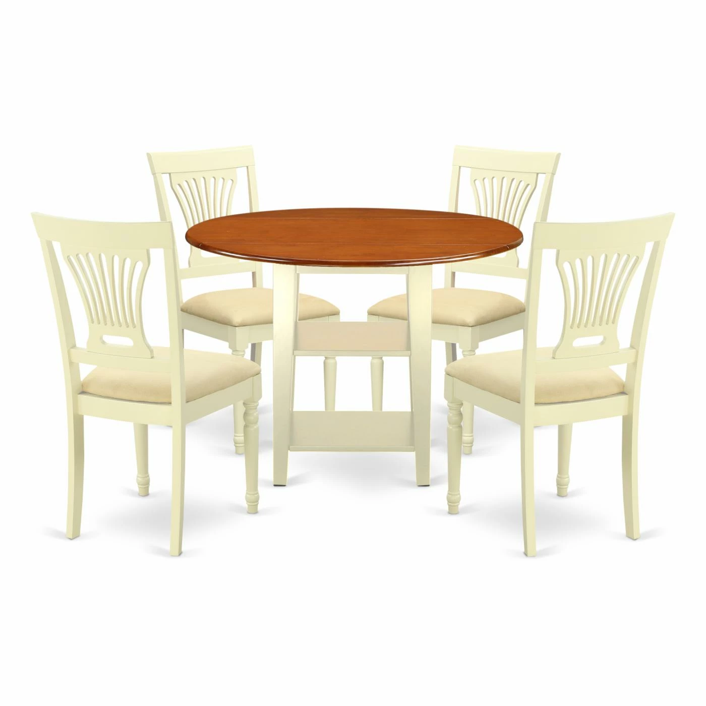 Upgrade your small dining space with the East West Furniture Sudbury 5 Piece Round Dual Drop Leaf Dining Table Set. This handsome dinette set includes a round table with two drop leaves that extend out to offer seating for four. Within its pedestal base are two fixed open shelves that are just right for adding your own character pieces or for storage baskets. The four included chairs have slatted fan backrests and sit on turned wood front legs. Customize your comfort by choosing from the available seat types. A solid rubberwood construction ensures this set will be with you for years. Make it yours by choosing from the available finish options.