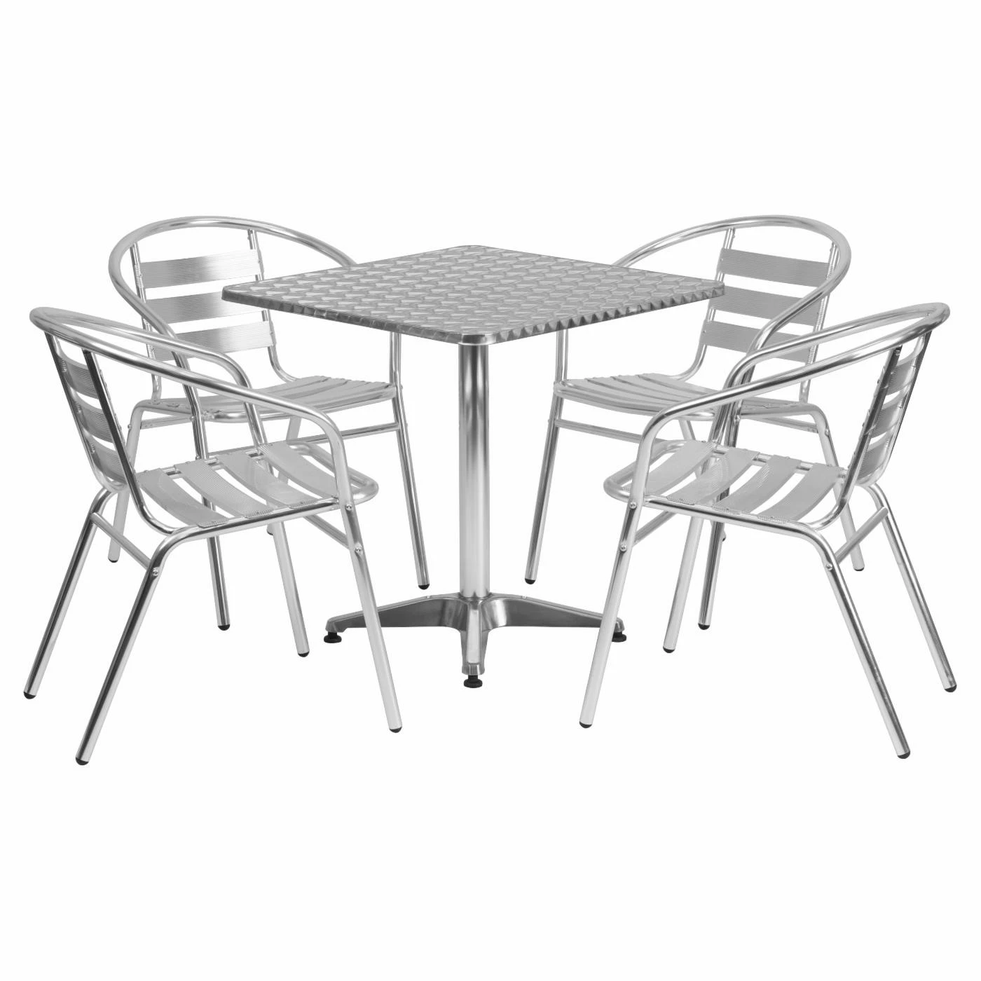 A great option for versatile placement, the Flash Furniture 27.5 in. Square Aluminum Indoor-Outdoor Table with 4 Slat Back Arm Chairs enriches your dining experience with a designer-inspired look you can place where you want. This durable, all-weather set is crafted from silver-finished, lightweight aluminum and includes a square table and four slat-style, wrap-around arm chairs that stack for easy storage. The smooth stainless steel tabletop provides a level surface for dishes and glassware, and the four-footed base keeps the table nice and stable.