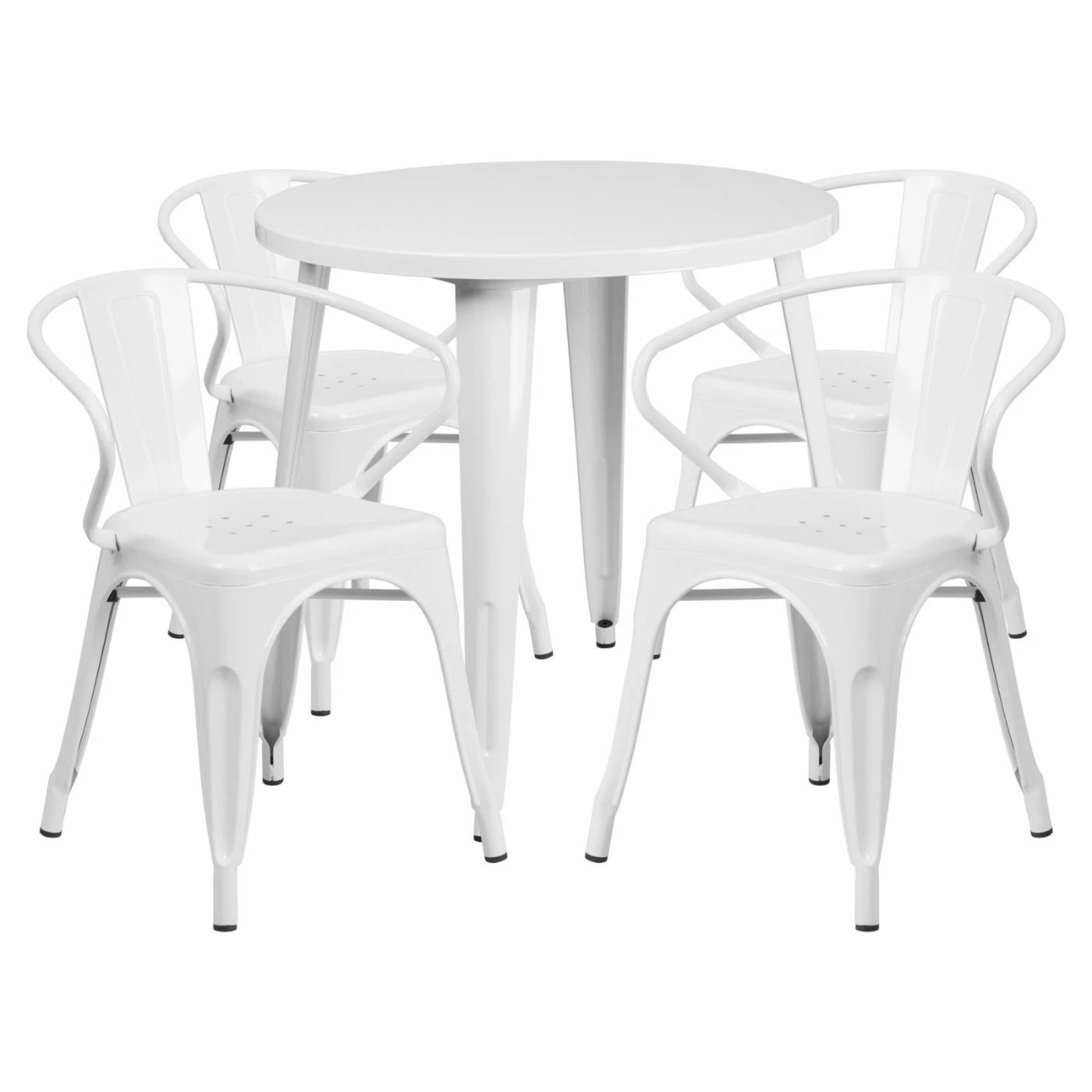 Make entertaining fun with the Flash Furniture 30 In. Round Metal Indoor-Outdoor Table Set with 4 Splat Back Arm Chairs, designed in a charming retro-modern style. This unique set includes four stackable bistro chairs with a rounded back and a slat design along with a matching bistro table. Choose your favorite available color to give your outdoor patio space or indoor dining area a vibrant, unique look.