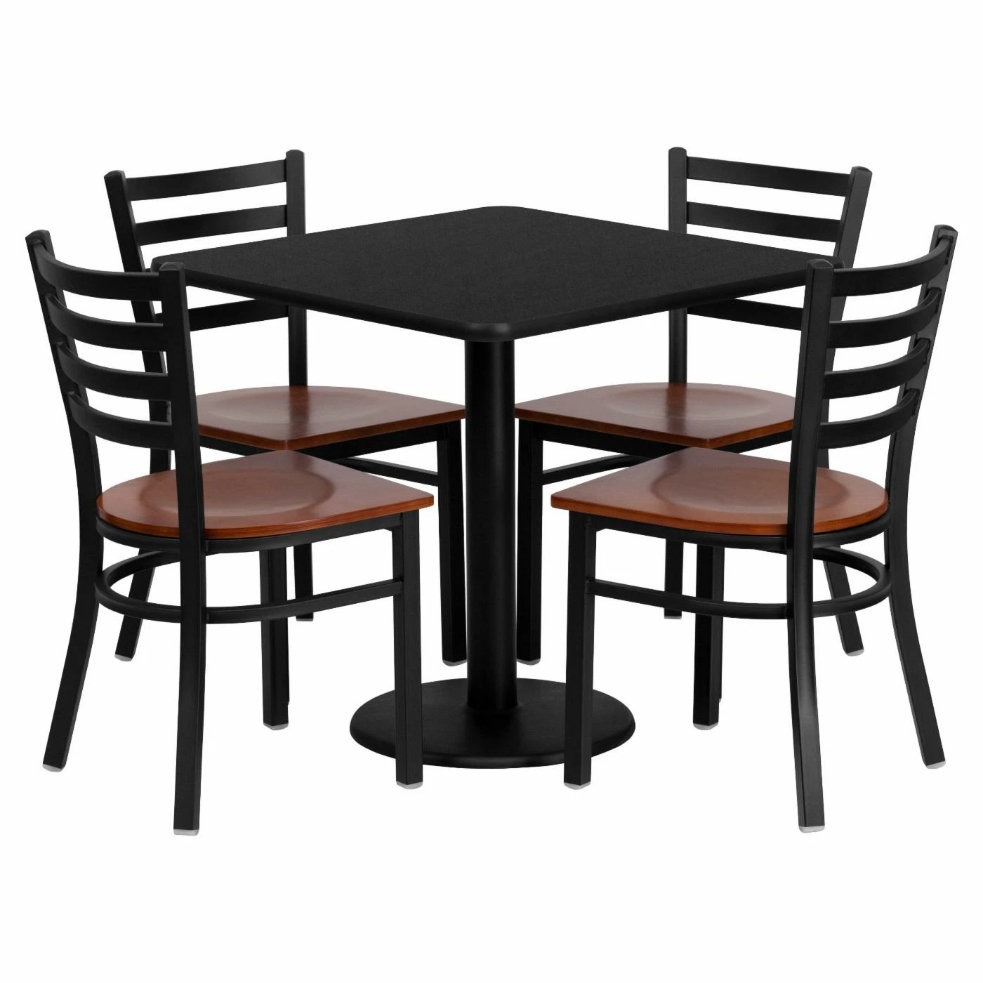 Provide strong and stylish seating to your special occasions with the Flash Furniture 30 in. Square Black Laminate Table Set with 4 Cherry Wood Seat Ladder Back Metal Chairs. A square, laminate-topped table and ladder-back chairs give you a complete set that’s solidly constructed from black-coated steel for commercial-grade quality. The contrasting cherry-finished, engineered wood seats are subtly contoured for added comfort.