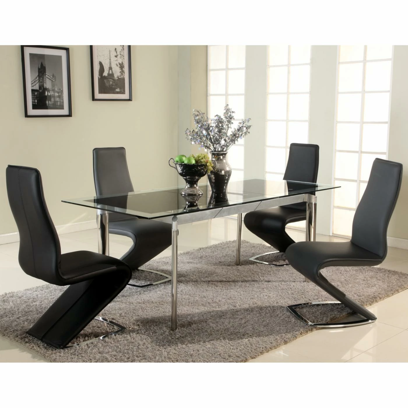 The accommodating design and modern appeal of the Chintaly Tara 5 Piece Dining Table Setmake it a perfect addition to your home. The extendable table features a sleek metal base and glass top. The unique chairs are upholstered in black, white, or gray.