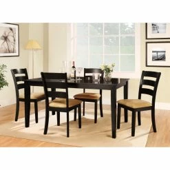 Dreary dinners and mundane munchies will be a thing of the past once you add the Tibalt 5 pc. Rectangle Black Dining Table Set – 60 in. with Ladder Back Chairs to your dining area. Sure to add some zing to any meal, this dining set comes complete with four chairs and a rectangle-shaped table. Itβs constructed of rubberwood solids and finished in a rich black thatβs wonderfully versatile. The chairβs ladder-back design creates a light, airy appeal, and the seats are both chic and comfy thanks to the cream-colored microfiber upholstery. Tapered legs on both chairs and table complete this canβt-miss look. Some assembly will be required.