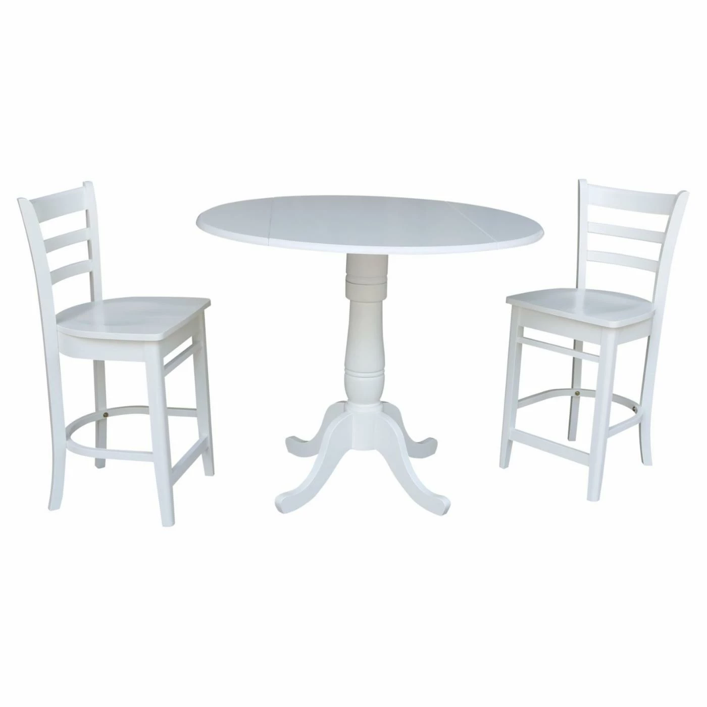 With a nod to farmhouse style, the International Concepts 3 Piece Round Pedestal Gathering Height Drop Leaf Table Set is completed in a crisp and classic white finish. You’ll love this sturdy table set crafted of solid parawood with two matching chairs. The gathering-height pedestal table boasts a round tabletop with drop leaves for added functionality.