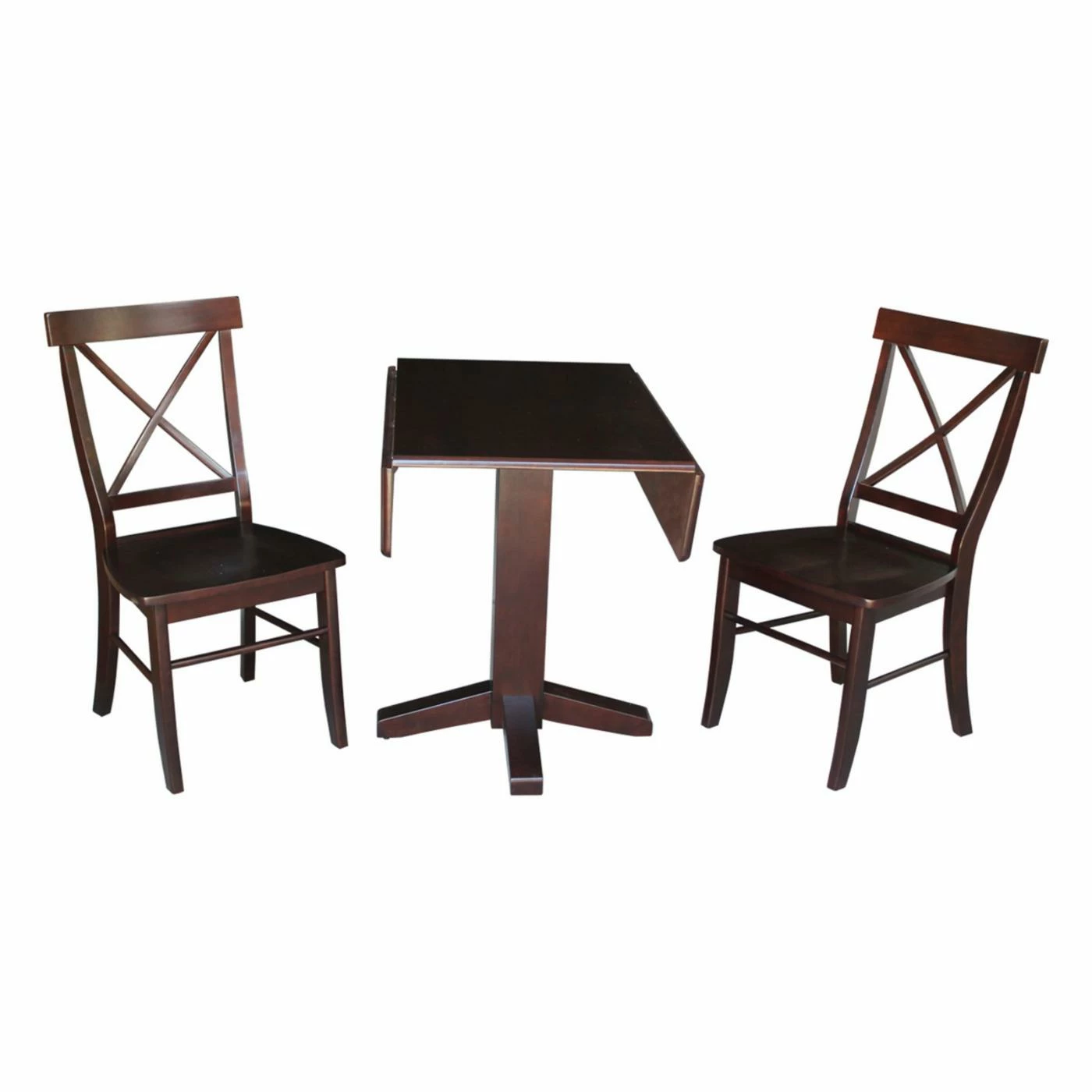 Introduce modern farmhouse style into your eat-in kitchen or breakfast nook with the International Concepts Dual Drop Leaf Square 3 Piece Table Set with X-Back Chairs. This set includes a square drop-leaf dining table with squared pedestal base and two X-back chairs. All are crafted from solid wood and come in a rich mocha finish. The table has a butcher block surface and two 9-inch drop leaves. This dining set seats two people.