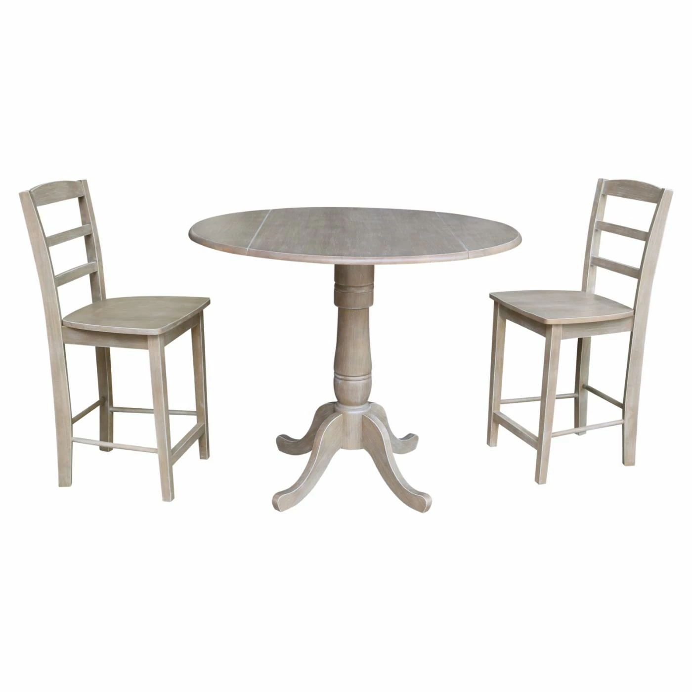Bring your dining space to a whole new level with the International Concepts Janice 3 Piece Round Pedestal Gathering Height Table Set, featuring a gathering-height table and two matching chairs. This sturdy set is crafted of wood, and the washed gray taupe finish lends it plenty of rustic appeal. The round tabletop includes a drop leaf design to give your home a versatile eating space.
