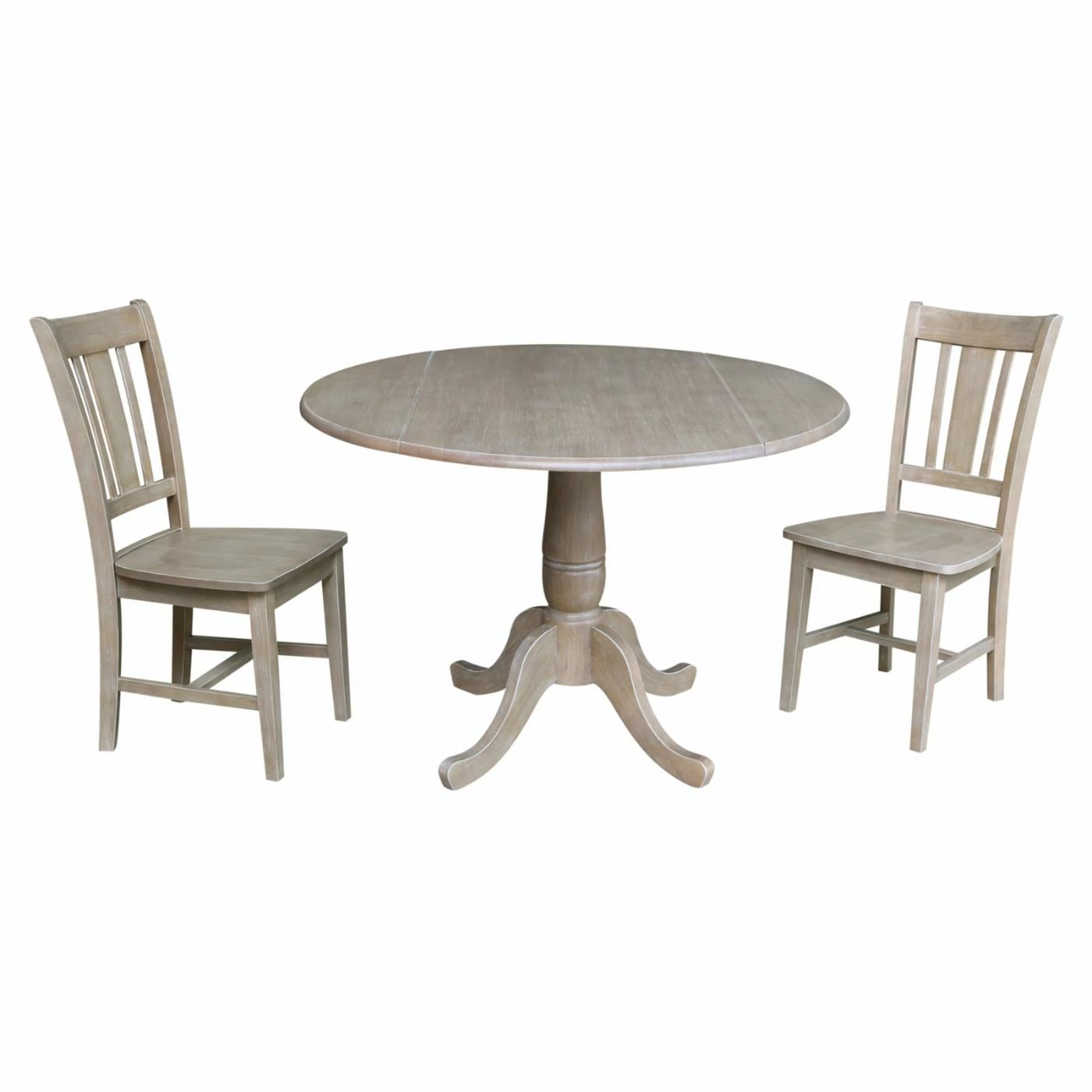 Experience a warm dining experience with the International Concepts Jordan 3 Piece Round Pedestal Table with 2 Chairs, crafted of wood in a washed gray taupe finish for a rustic touch. This sturdy set includes a round table with a pedestal base that features two drop leaves for versatility. A pair of sturdy, stylish chairs rounds out its appealing aesthetic.