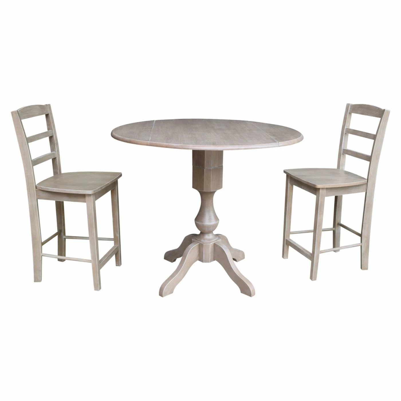 From morning coffee to conversations with friends, the International Concepts Lauren 3 Piece Round Pedestal Gathering Height Table Set adds a welcoming element to your home. Made of sturdy wood, this gathering-height table set includes a pair of sturdy chairs all featured in a washed gray taupe finish. The round pedestal table features two drop leaves for added versatility.