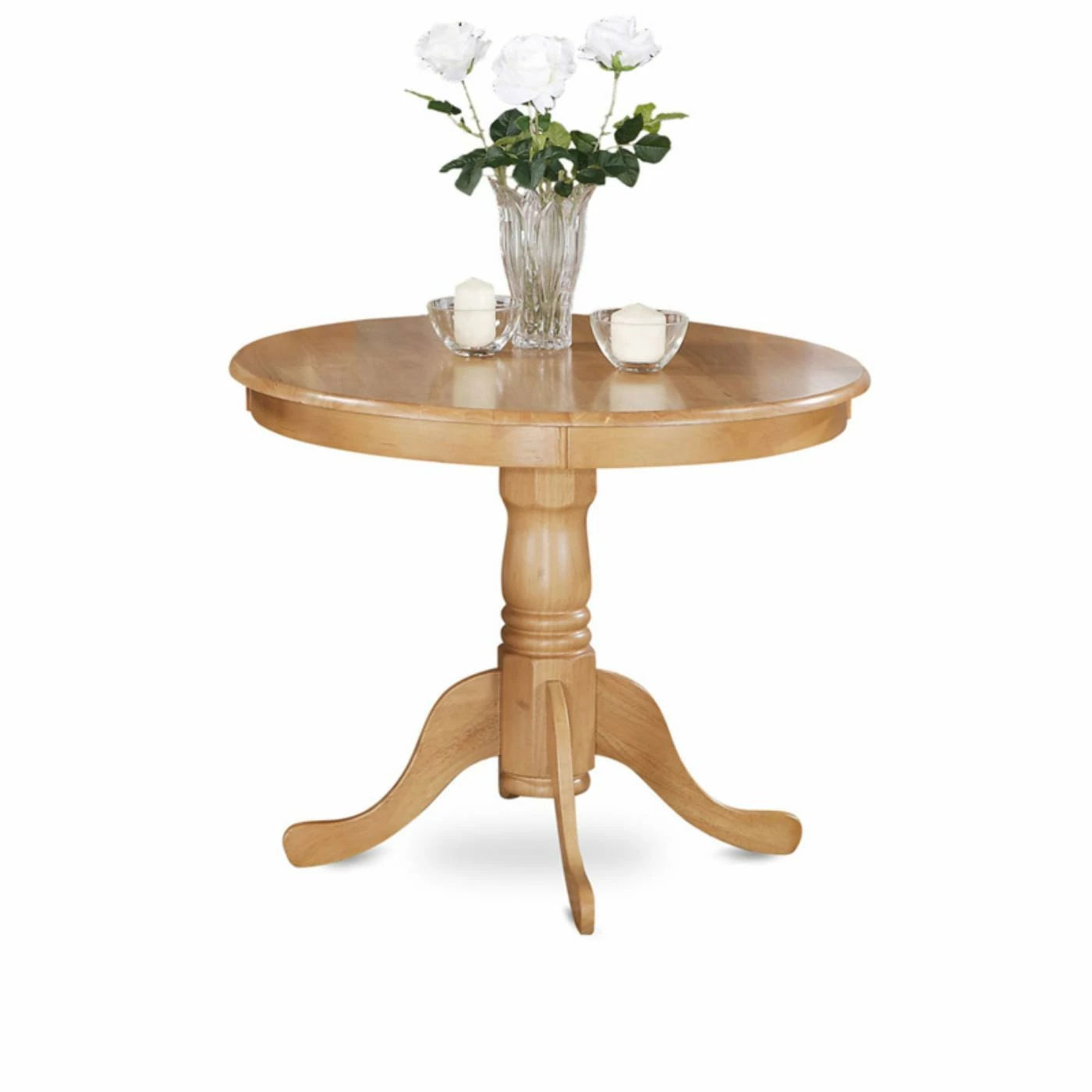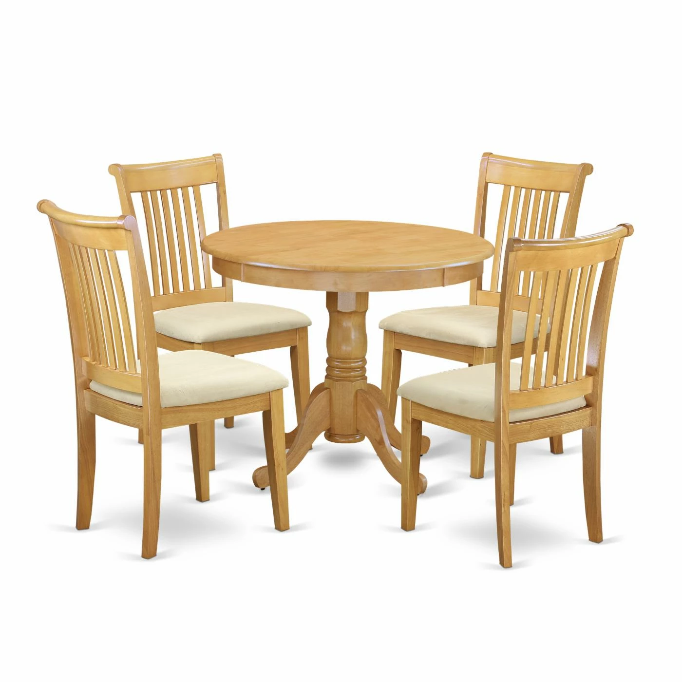 A simplified, compact take on timeless dining furnishings, the East West Furniture Antique ANPO5 Five Piece Round Pedestal Dining Set is perfect for small transitional eat-in kitchens, dining rooms, and breakfast nooks. The set contains a round table with a regal pedestal base and four chairs with slat, rolled backs. Every piece is durably crafted out of solid wood and flaunts a light natural oak finish. You can choose the seat type that you prefer from the available options.