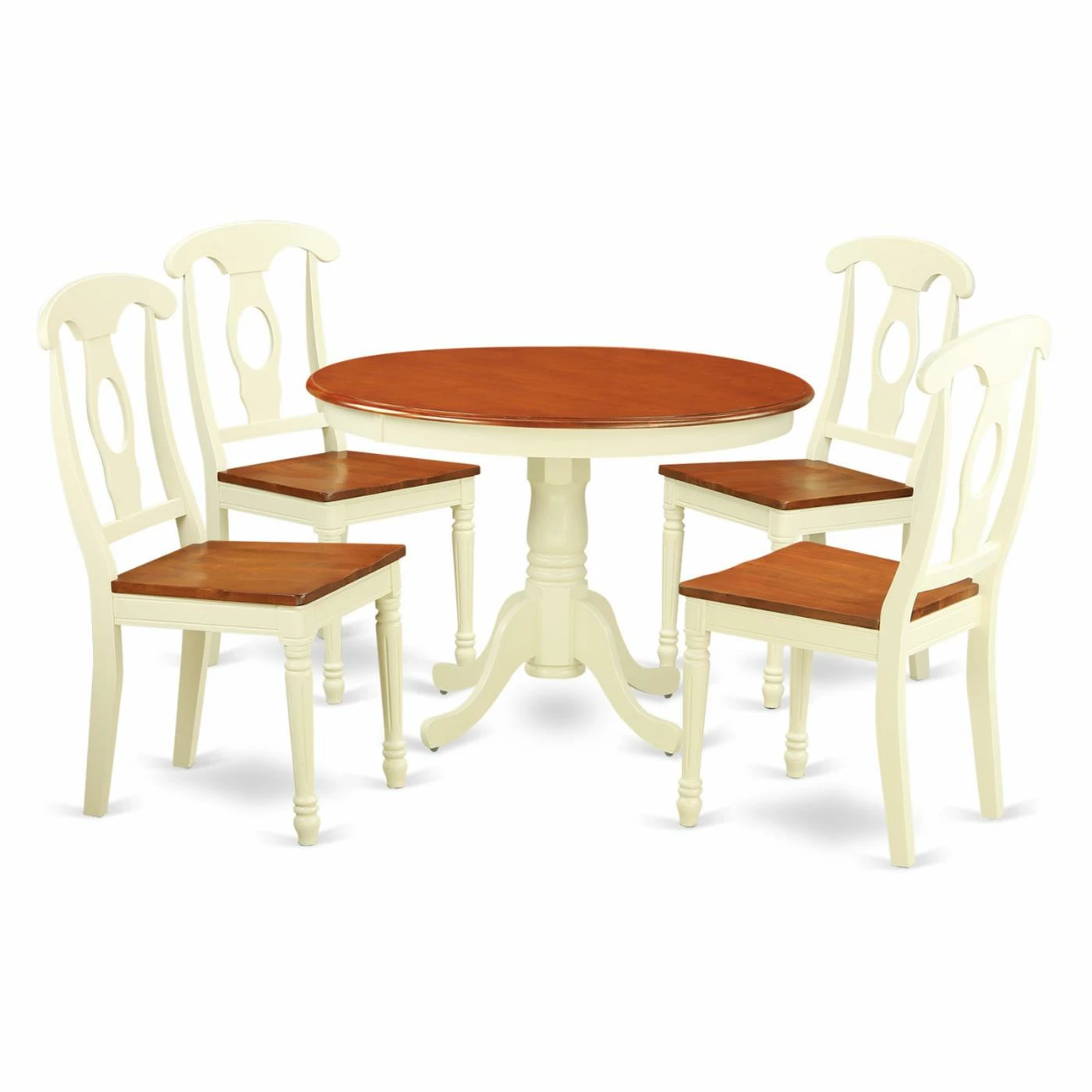The East West Furniture Hartland 5 Piece Keyhole Dining Table Set is an efficient way to quickly redecorate your dining room with casual charm. This set boasts a round pedestal dining table and four matching armless chairs. The chairs’ forelegs and pedestal come accented with turned details. Mission-style splat-backs define the chairs, boasting curved crowns and an open center keyhole design. Set is constructed from solid hardwood. Choose finish and seat option from available.
