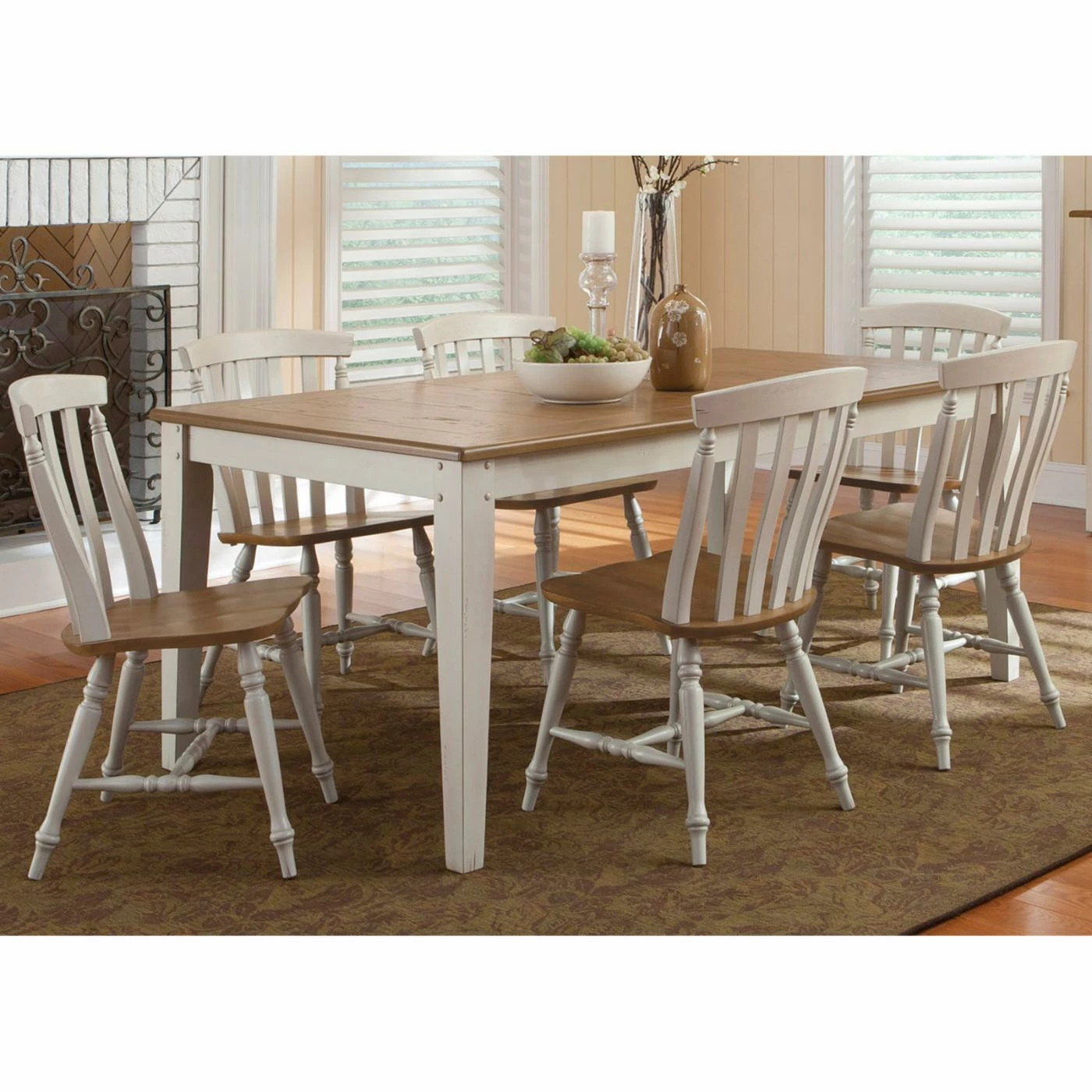 The updated farmhouse look of the Liberty Furniture Canton 7-piece Rectangular Table Set is evident in its casual two-toned sand and driftwood finish. The set includes a rectangular dining table and six dining chairs. Rubberwood solids and pin knotty veneers boast that laid back two-toned finish. Chairs feature double X-backs and turned front legs. The table in this dining set has contemporary tapered legs and seats six comfortably.