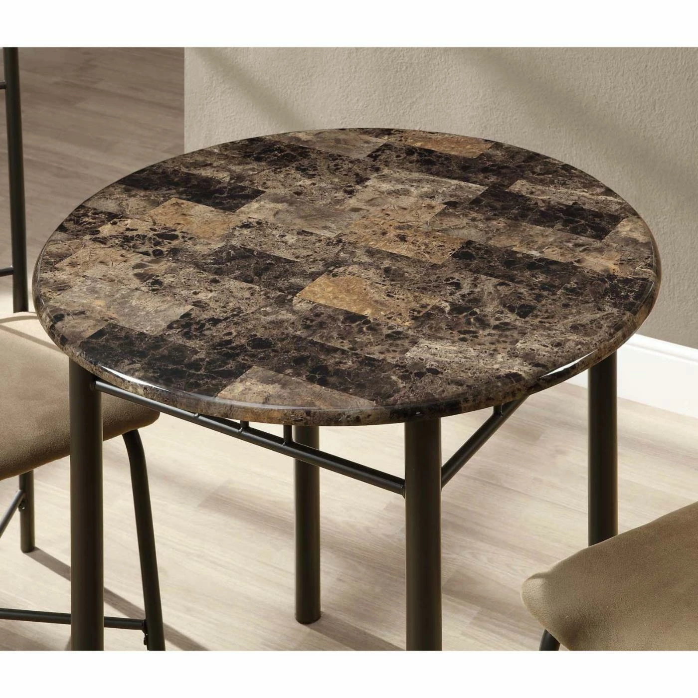 Sturdy metal frames are finished in a rich bronze tone, and the round tabletop is crafted of faux marble in a rich cappuccino finish. Chairs feature cushioned seats with fabric upholstery combined with vertical slat backs and an eye-catching triple circle motif along the top.