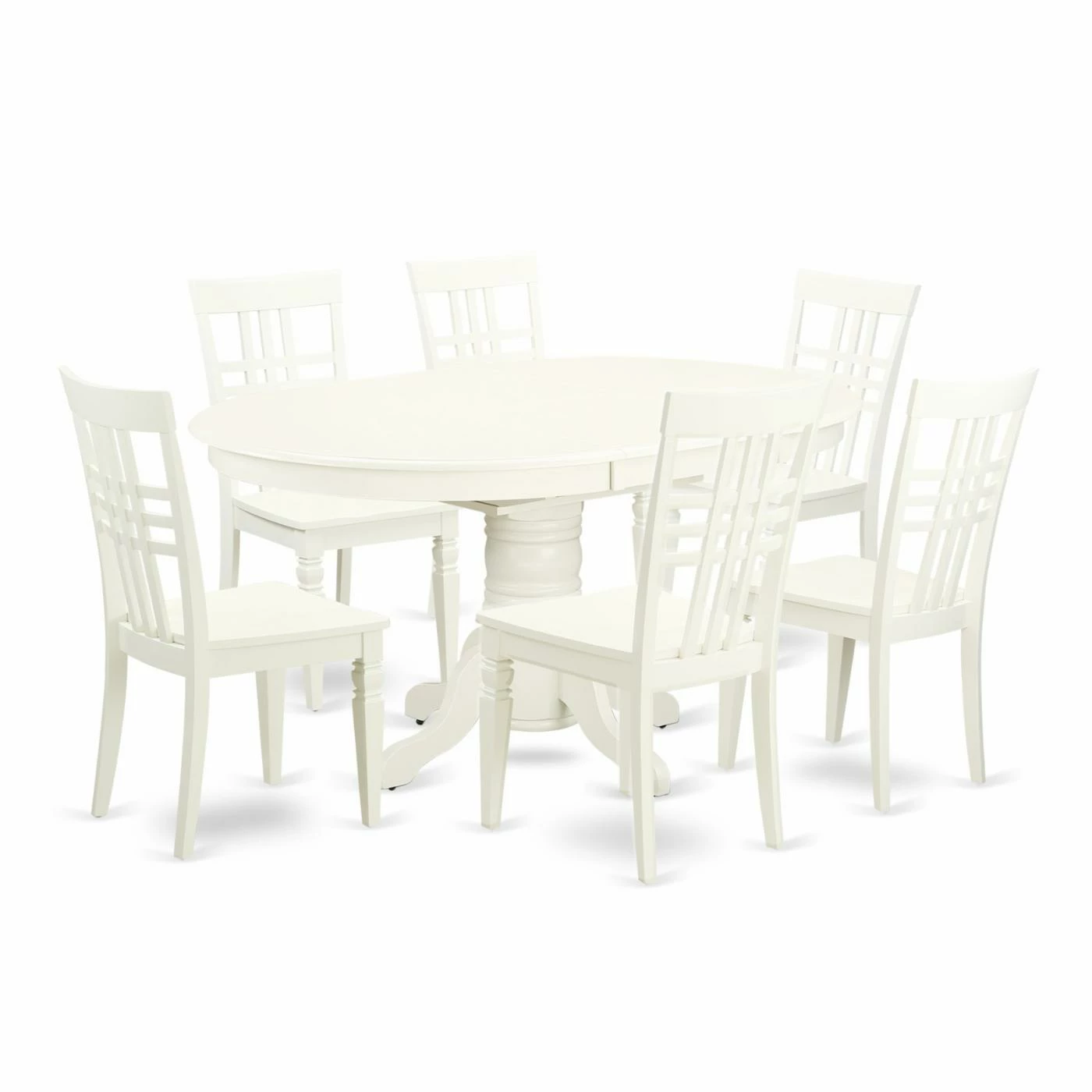 Get your dining room or kitchen ready for a crowd in minutes with the East West Furniture Avon AVLG7 Seven Piece Extension Dining Table Set. The round pedestal dining table expands to a 60-inch oval with a leaf that stores out of the way in between uses. For a modern finishing touch, the set includes six dining chairs with ergonomic crisscross backs. Durable enough for daily use, the furnishings are fashioned out of sturdy, solid rubberwood.