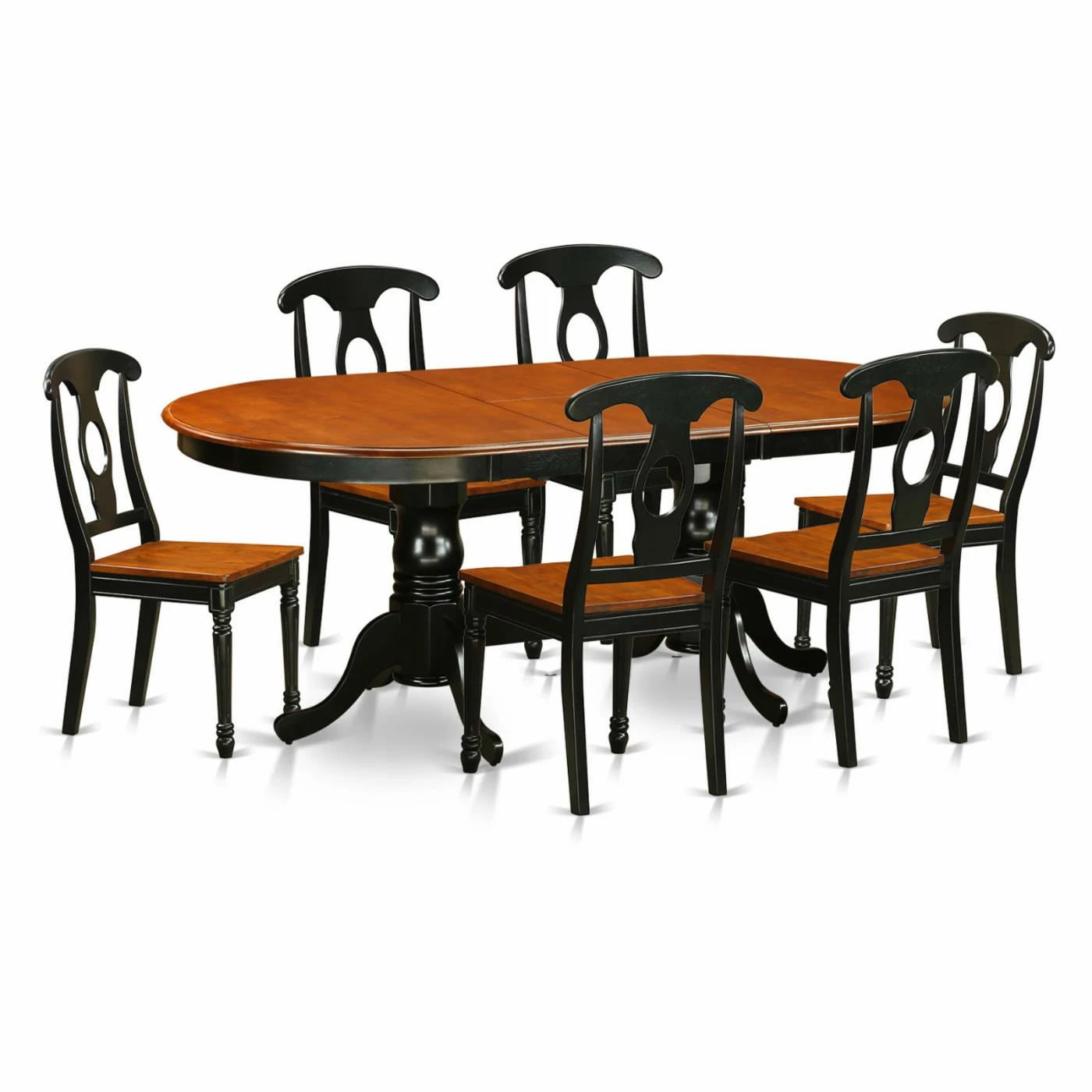 The East West Furniture Plainville 7 Piece Keyhole Dining Table Set includes six keyhole back chairs and a turned double pedestal table with self-storing extension leaf. The leaf extends the table from a circle for four into an oval that seats eight and then stores beneath the table. Chairs come in your choice of available seat type. This dining set is crafted of solid Asian hardwoods and is offered in your choice of available finishes.