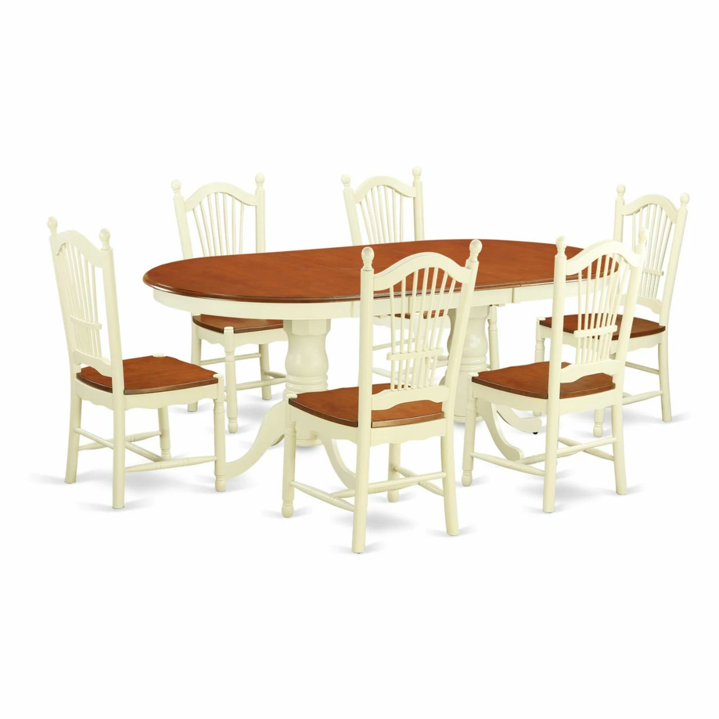 For a graceful dining space, add the East West Furniture Plainville 7 Piece Sheaf Dining Table Set. Included are six classically curvy sheaf-back chairs with finials, contrasting wood seats, and turned legs. A table with a turned double pedestal table and self-storing extension leaf that extends it from a circle to an oval that can seat eight makes the set complete. Pieces are crafted from solid Asian hardwoods in an antique white and cherry finish.