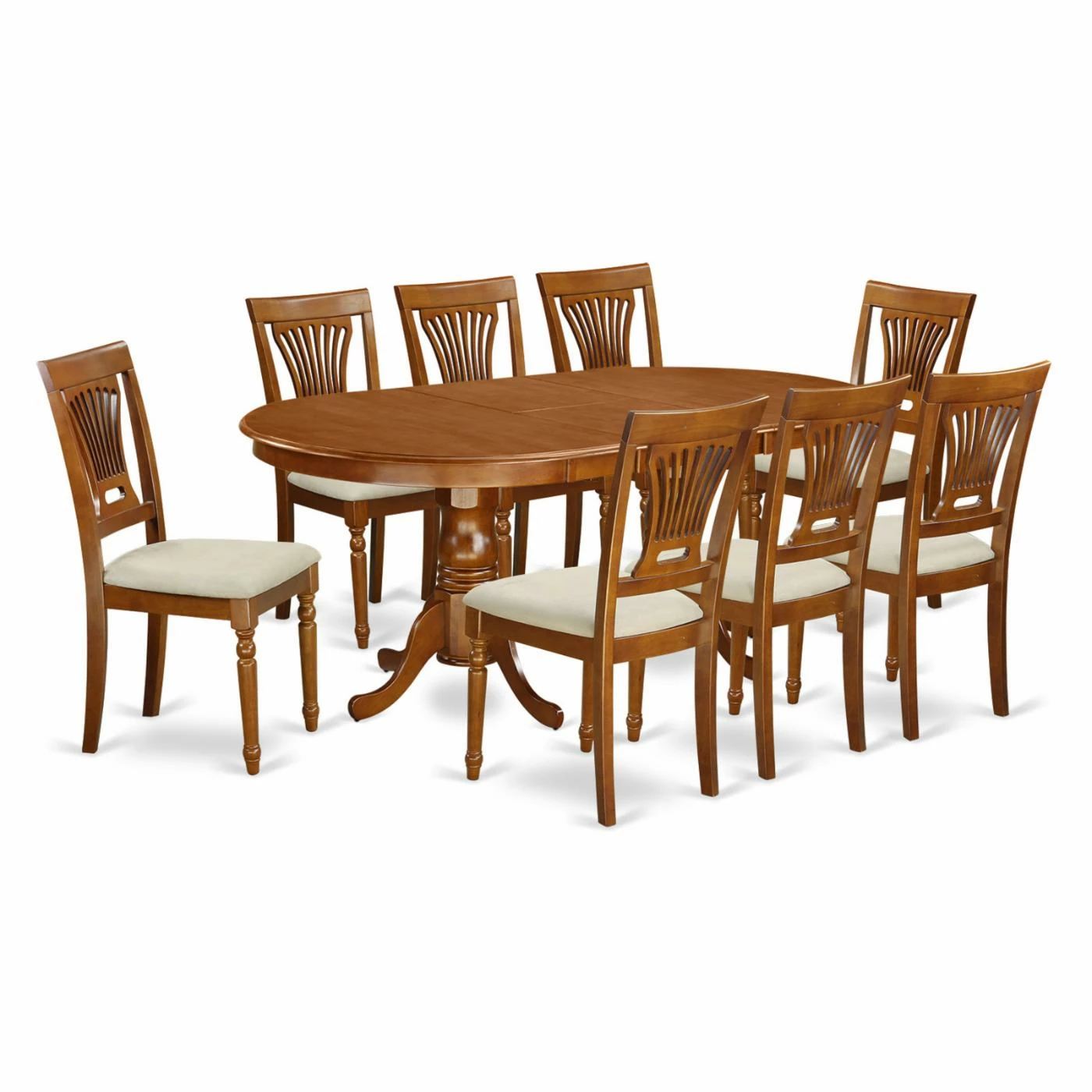 Perfect for large and small family gatherings, the East West Furniture Plainville 9 Piece Empire Dining Table Set expands from a circle for four into an oval that seats eight. This set includes eight classic sheaf-back chairs in your choice of available seat type plus a turned double pedestal table with self-storing leaf. Pieces are built of solid Asian hardwoods and offered in a choice of available finishes.