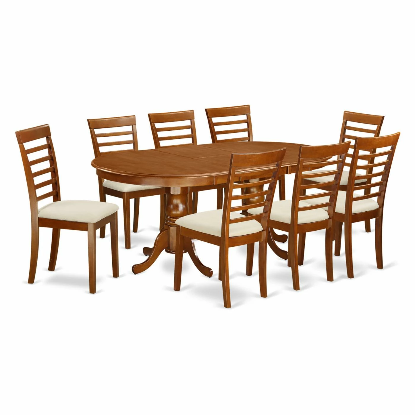Upgrade small and large gatherings with the East West Furniture Plainville 9 Piece Straight Ladder Back Dining Table Set. The set includes eight chairs and a table that expands from a circle for four into an oval that seats eight. The chairs feature straight ladder back designs, tapering legs, and come in your choice of available seat type. The table features a turned double pedestal base and self-storing leaf. Pieces are constructed of solid Asian hardwoods and offered in an inviting saddle brown finish.