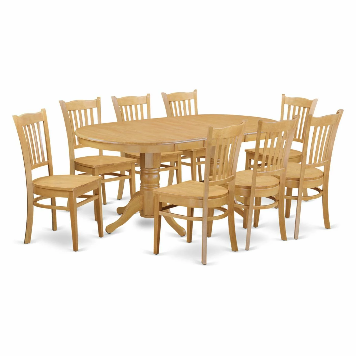 You’re all set to set the table for those big family dinners when you’ve got the East West Furniture Vancouver 9 Piece Comb Back Dining Table Set. With a versatile style that’s right at home in traditional, transitional, and modern décors, this dining set includes an oval-shaped double pedestal table and eight chairs with classic vertical slat backs. Each piece, finished in a warm oak tone, is crafted of 100% Asian hardwood using no MDF, fiberboard, or laminate for excellent durability. The table also includes a 17-inch butterfly extension leaf that stores right under the tabletop when not in use.