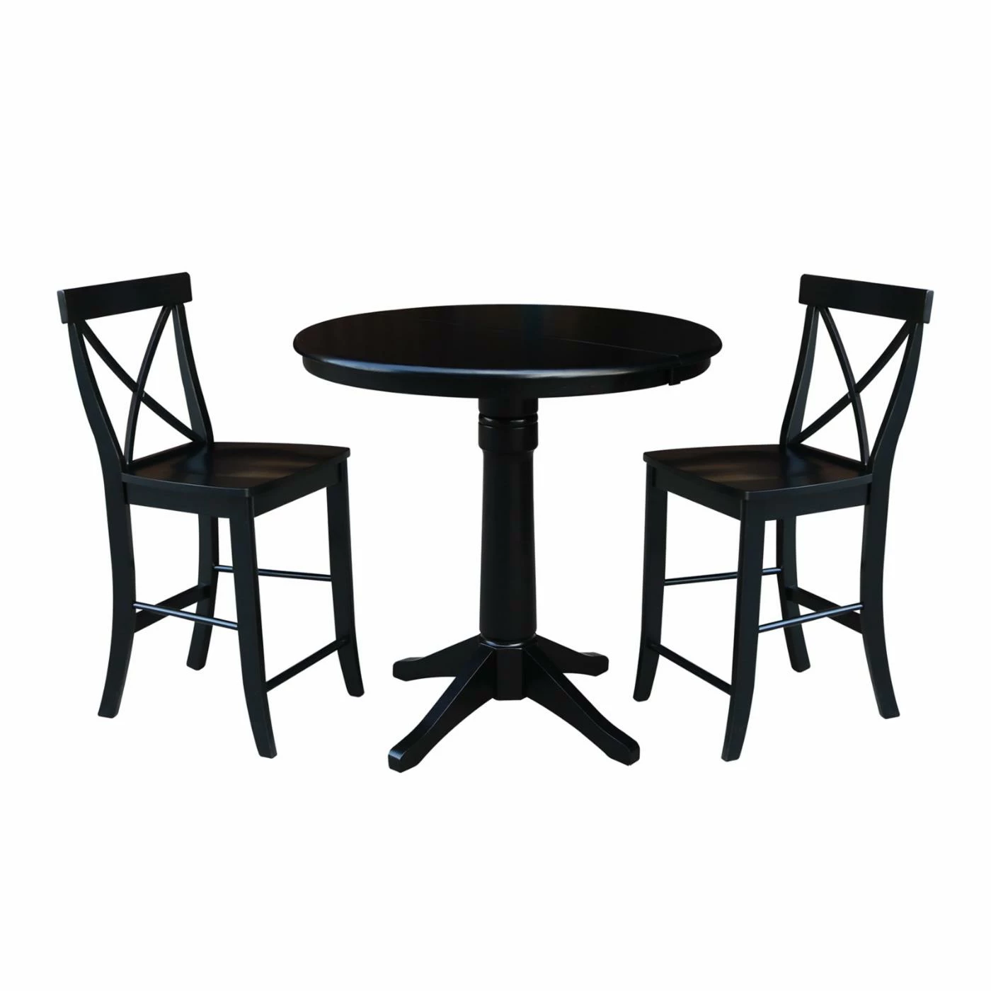 The International Concepts 3 Piece Counter Height Dining Table with Extension Leaf and 2 Cross Back Chairs combines the sleek aesthetic of contemporary styles with the classic forms of traditional furniture. In this set you get a pair of chairs that gather around a central table. The butcher-block table top pulls apart easily, allowing you to add a 12-inch extension leaf. Each piece in this set is built from solid hardwood with a multi-step finish in jet black. The chairs offer the comfort of contoured seats and a curved backrest along with the strength of box-seat construction.