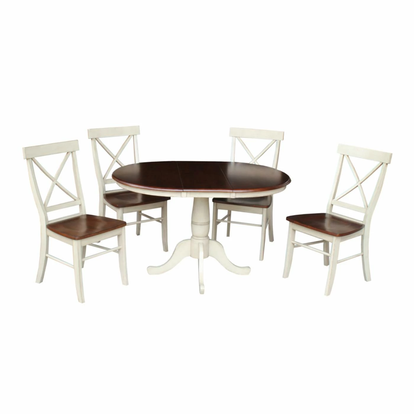 The International Concepts Raymond 5-Piece 36 in. Round Extension Dining Set is an affordable and attractive dining room or kitchen suite that serves as the perfect backdrop to everyday meals, holiday feasts, and other special occasions. This charming table is crafted from solid wood with a round butcher block top in warm espresso elevated by a carved plantation hardwood pedestal base in an elegant antique almond hue. The 36 in. top slides apart on smooth-operating steel glides, forming a generous oval shape. Using the included 12 in. leaf creates even more room for a few extra plates and, of course, the four matching X-back chairs that are also a part of this fantastic set! Some assembly is required.