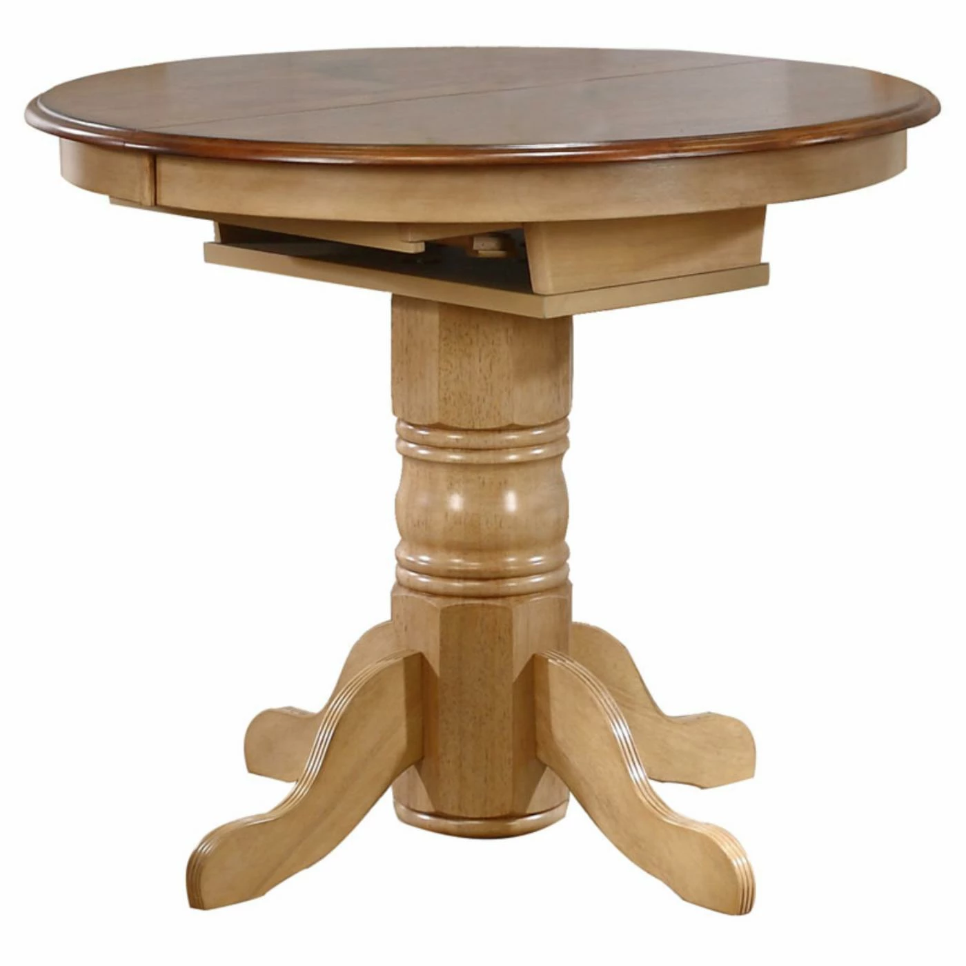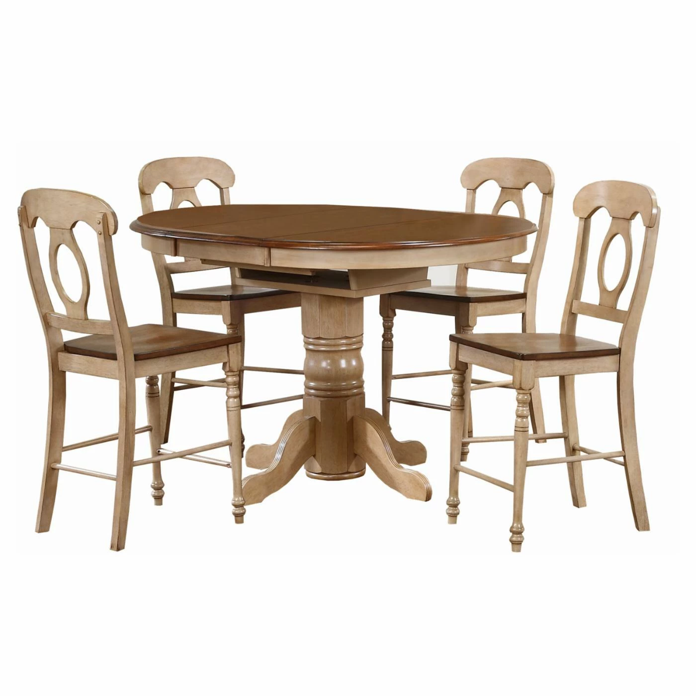The ridges of the Sunset Trading 5-Piece Brook Butterfly Leaf Pub Dining Table Set with Napoleon Stools table’s pedestal base and chair’s legs add eye-catching textural detail to this clean, classic set. Soft, natural hues finish the eco-friendly design, creating a welcoming place for sharing meals with family and friends.