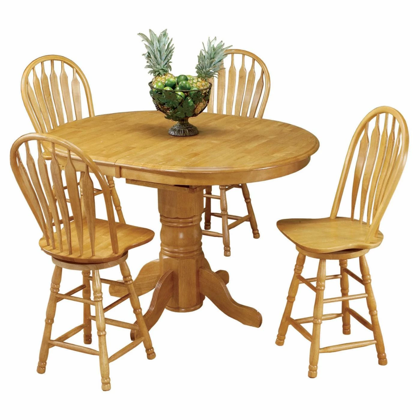 The timeless and transitional Sunset Trading 5 Piece Pedestal Butterfly Leaf Cafe Table Set with 24 in. Comfort Barstools welcomes your guests into your home. Whether it’s casual cocktails, everyday dining, holidays or special occasions, create a party room environment when family and friends gather around this versatile pub and dining table. Handcrafted from solid wood with four swiveling, Windsor style barstools, the table features a pedestal base with adjustable levelers to help protect your floors. Itโs also available in your choice of finish. Warm and inviting, the classic beauty and design of this pub set makes it equally appropriate for your kitchen, dining room or game room. The superior solid wood craftsmanship is designed to last for generations!